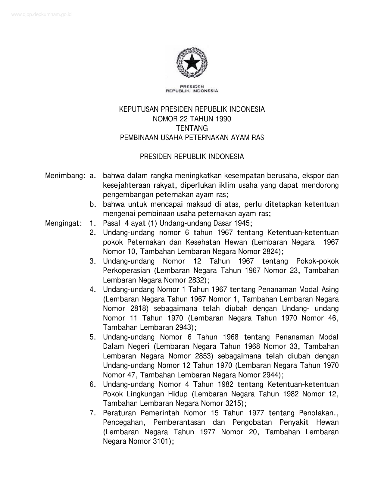 KEPPRES Nomor 22 Tahun 1990 | Keputusan Presiden Nomor 22 Tahun 1990 tentang PEMBINAAN USAHA PETERNAKAN AYAM RAS