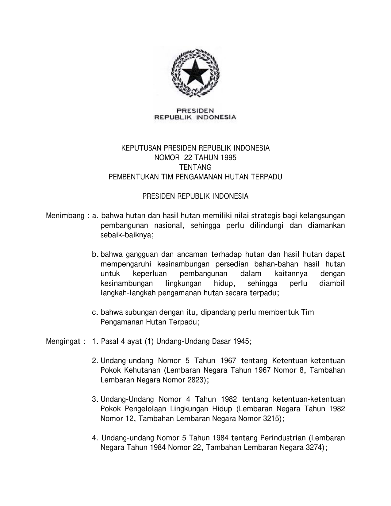 KEPPRES Nomor 22 Tahun 1995 | Keputusan Presiden Nomor 22 Tahun 1995 tentang PEMBENTUKAN TIM PENGAMANAN HUTAN TERPADU