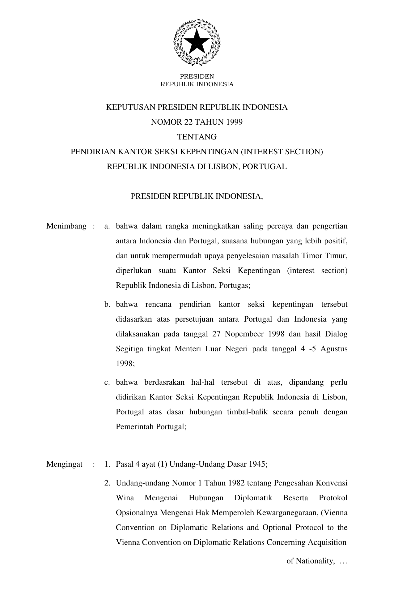KEPPRES Nomor 22 Tahun 1999 | Keputusan Presiden Nomor 22 Tahun 1999 tentang PENDIRIAN KANTOR SEKSI KEPENTINGAN (INTEREST SECTION) RI DI LISBON, PORTUGAL