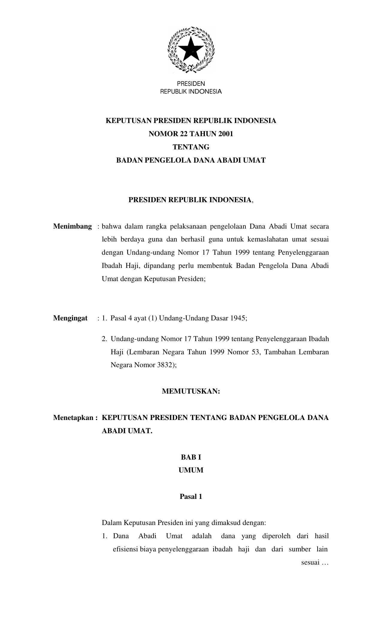 KEPPRES Nomor 22 Tahun 2001 | Keputusan Presiden Nomor 22 Tahun 2001 tentang BADAN PENGELOLA DANA ABADI UMAT