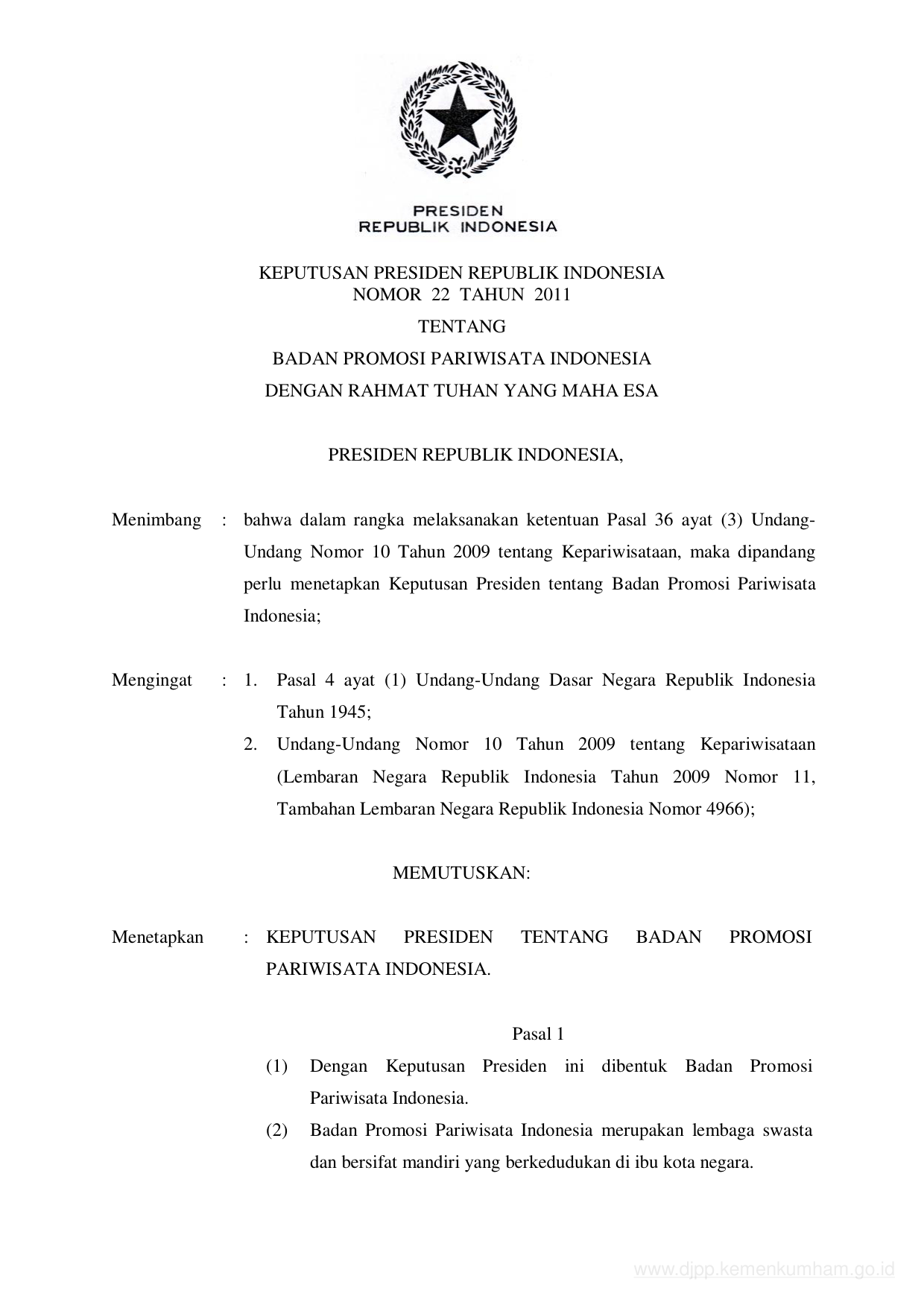 KEPPRES Nomor 22 Tahun 2011 | Keputusan Presiden Nomor 22 Tahun 2011 tentang BADAN PROMOSI PARIWISATA INDONESIA