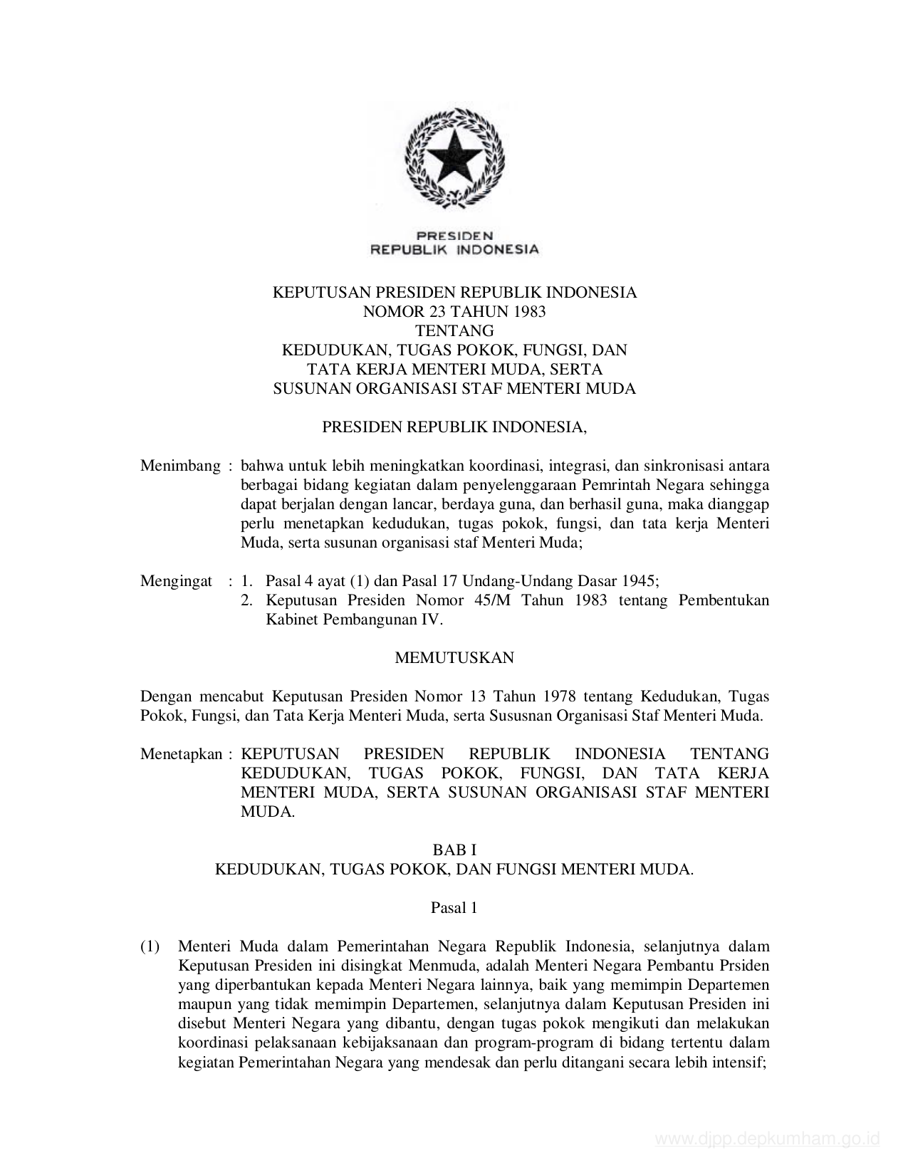 KEPPRES Nomor 23 Tahun 1983 | Keputusan Presiden Nomor 23 Tahun 1983 tentang KEDUDUKAN, TUGAS POKOK, FUNGSI DAN TATA KERJA MENTERI MUDA, SERTA SUSUNAN ORGANISASI STAFF MENTERI MUDA