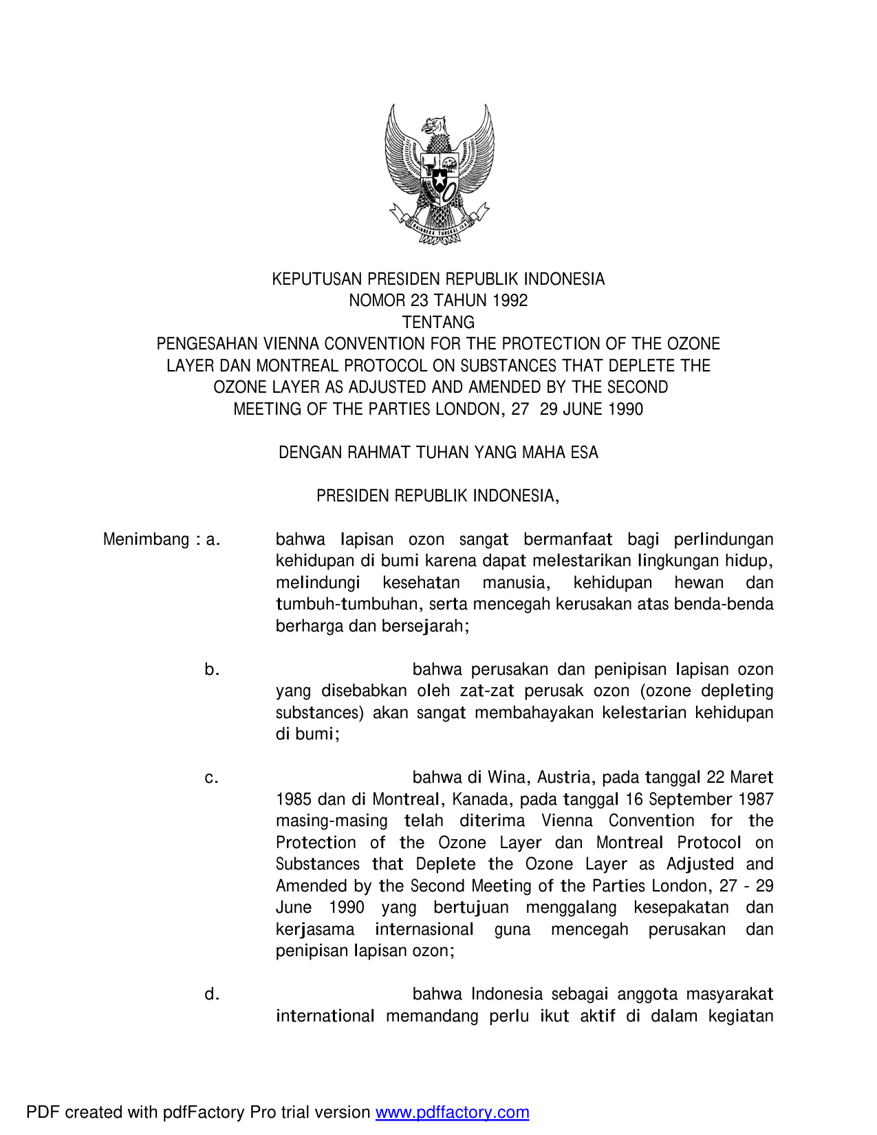 KEPPRES Nomor 23 Tahun 1992 | Keputusan Presiden Nomor 23 Tahun 1992 tentang PENGESAHAN VIENNA CONVENTION FOR THE PROTECTION OF THE OZONE LAYER DAN MONTREAL PROTOCOL ON SUBSTANCES THAT DEPLETE THE OZONE LAYER AS ADJUSTED AND AMENDED BY THE SECOND MEETING OF THE PARTIES LONDON
