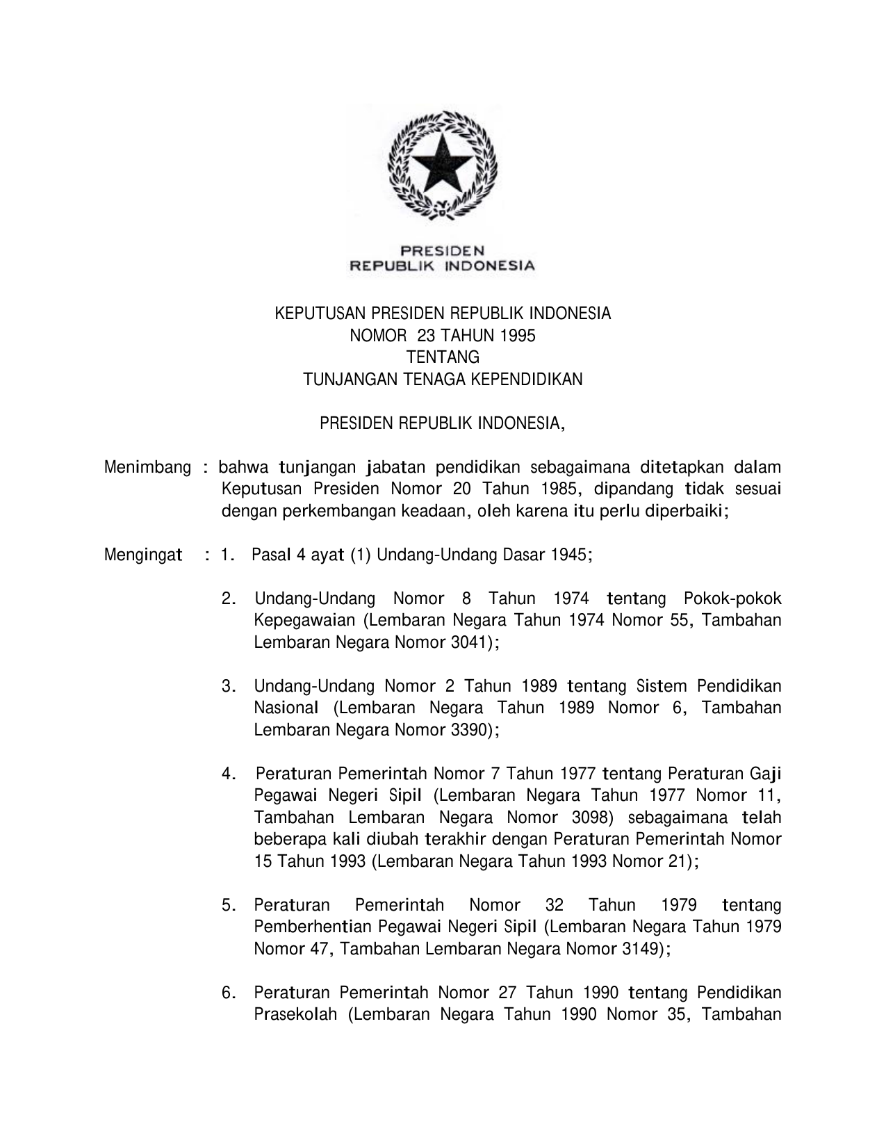 KEPPRES Nomor 23 Tahun 1995 | Keputusan Presiden Nomor 23 Tahun 1995 tentang TUNJANGAN TENAGA KEPENDIDIKAN