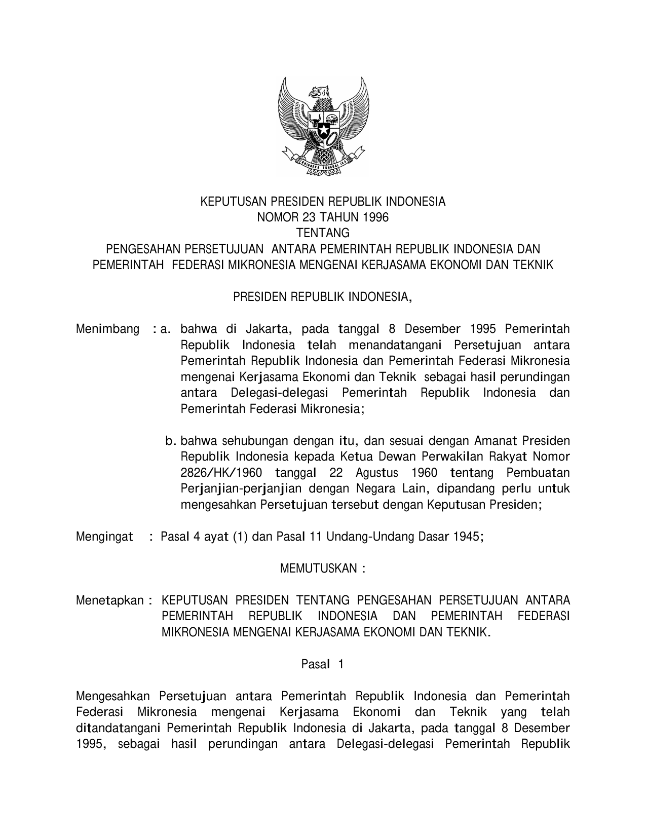 KEPPRES Nomor 23 Tahun 1996 | Keputusan Presiden Nomor 23 Tahun 1996 tentang PENGESAHAN PERSETUJUAN ANTARA PEMERINTAH RI DAN PEMERINTAH FEDERAL MIKRONESIA MENGENAI KERJASAMA EKONOMI DAN TEKNIK