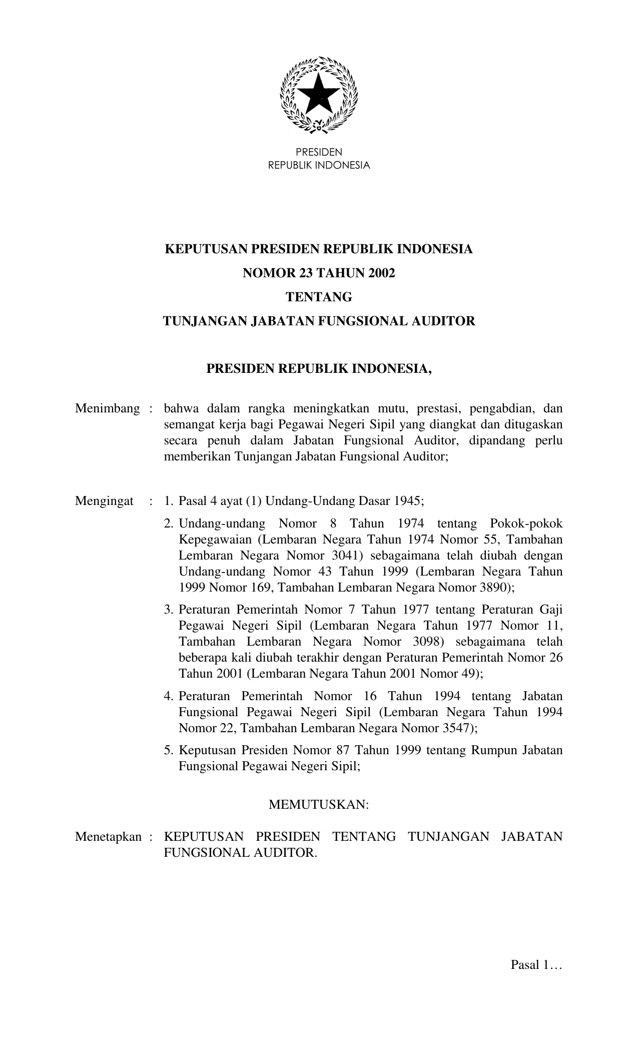KEPPRES Nomor 23 Tahun 2002 | Keputusan Presiden Nomor 23 Tahun 2002 tentang TUNJANGAN JABATAN FUNGSIONAL AUDITOR
