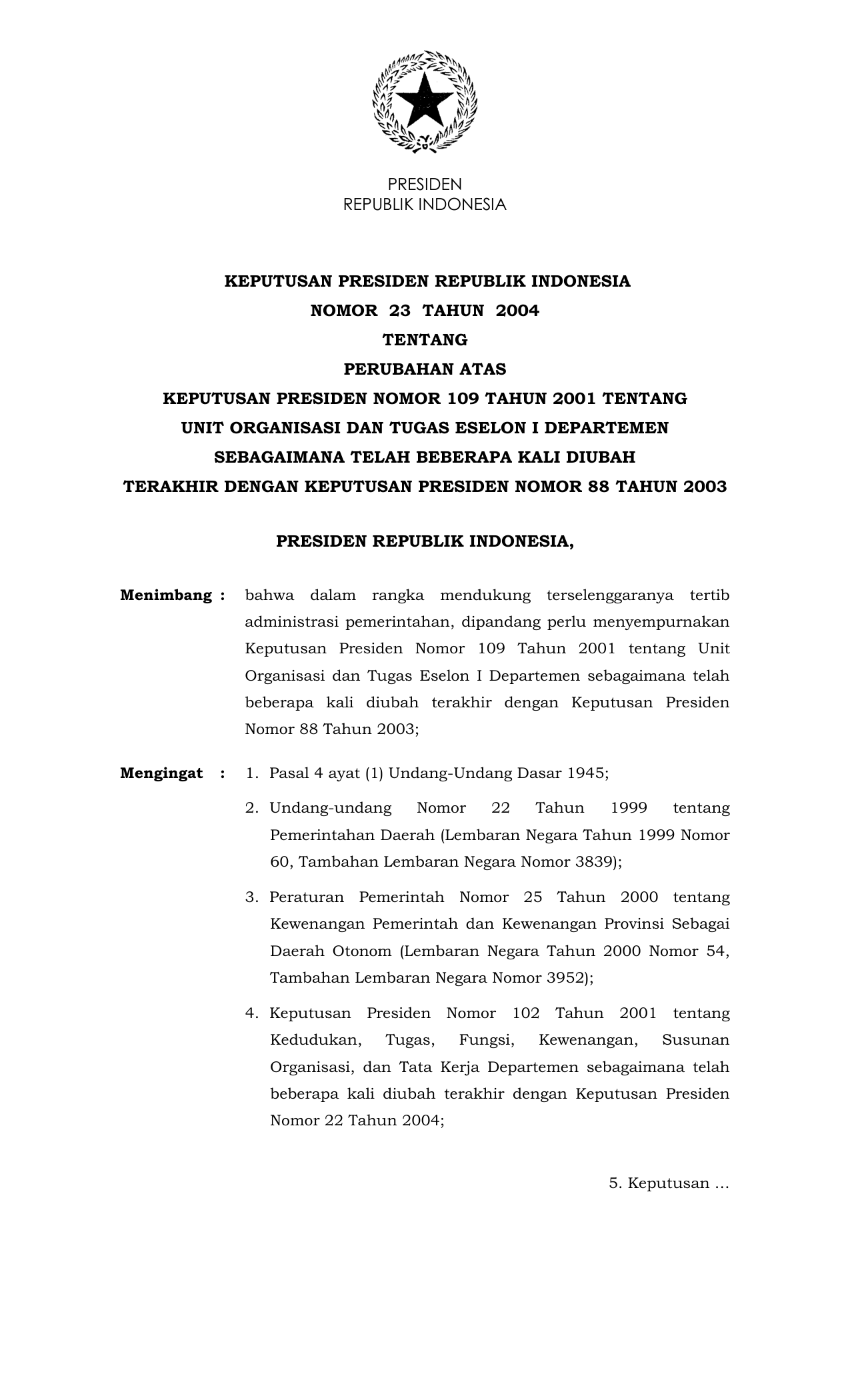 KEPPRES Nomor 23 Tahun 2004 | Keputusan Presiden Nomor 23 Tahun 2004 tentang PERUBAHAN KEPPRES 109-2001 TENTANG UNIT ORGANISASI DAN TUGAS ESELON I DEPARTEMEN SEBAGAIMANA TELAH BEBERAPA KALI DIUBAH TERAKHIR DENGAN KEPPRES 88-2003