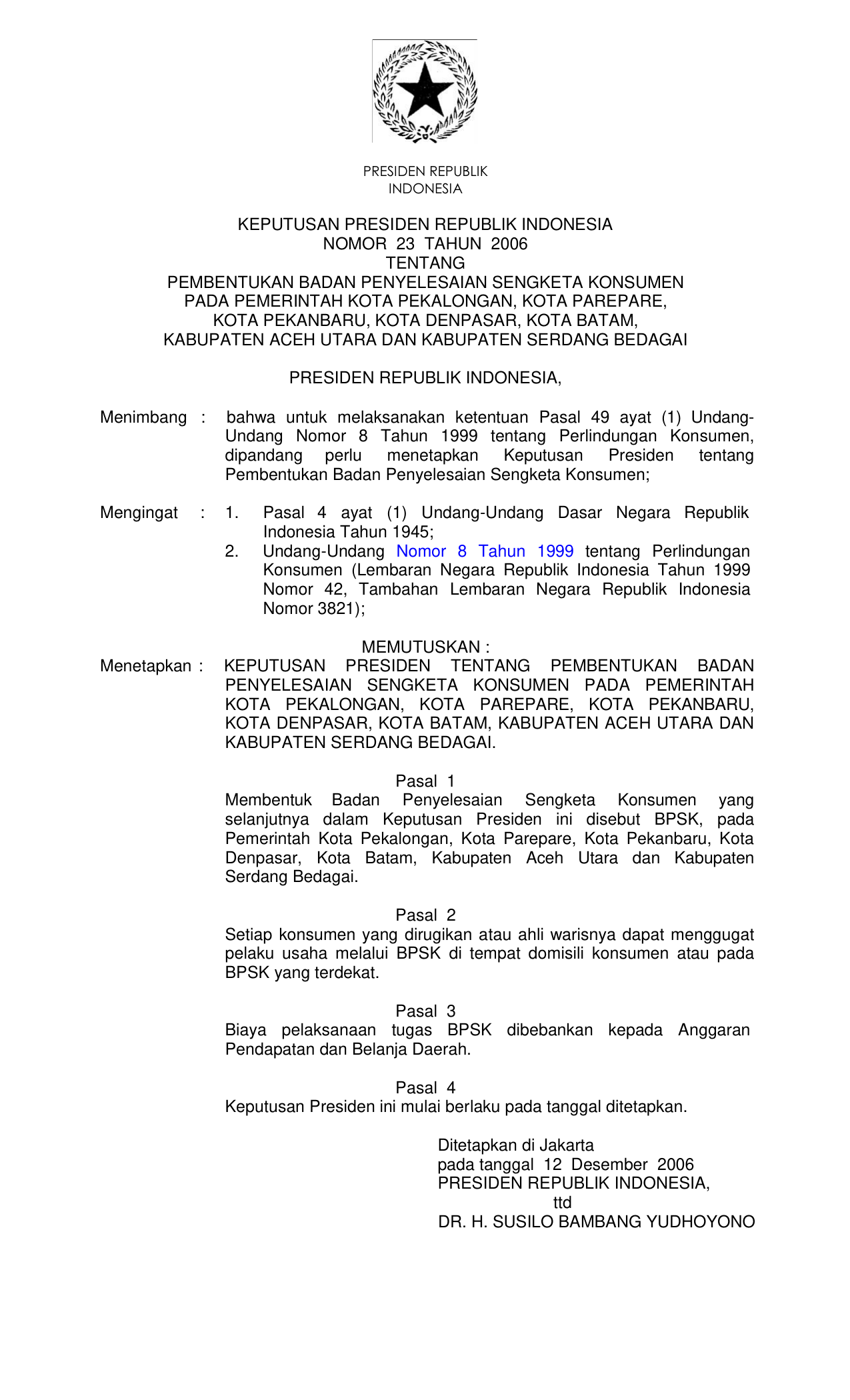 KEPPRES Nomor 23 Tahun 2006 | Keputusan Presiden Nomor 23 Tahun 2006 tentang PEMBENTUKAN BADAN PENYELESAIAN SENGKETA KONSUMEN PADA PEMERINTAH KOTA PEKALONGAN, KOTA PAREPARE, KOTA PEKANBARU, KOTA DENPASAR, KOTA BATAM, KABUPATEN ACEH UTARA DAN KABUPATEN SERDANG BEDAGAI