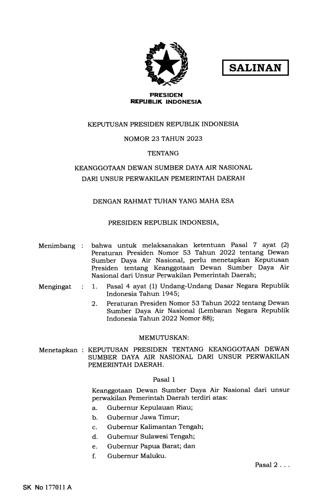 KEPPRES Nomor 23 Tahun 2023 | Keputusan Presiden Nomor 23 Tahun 2023 tentang KEANGGOTAAN DEWAN SUMBER DAYA AIR NASIONAL DARI UNSUR PERWAKILAN PEMERINTAH DAERAH