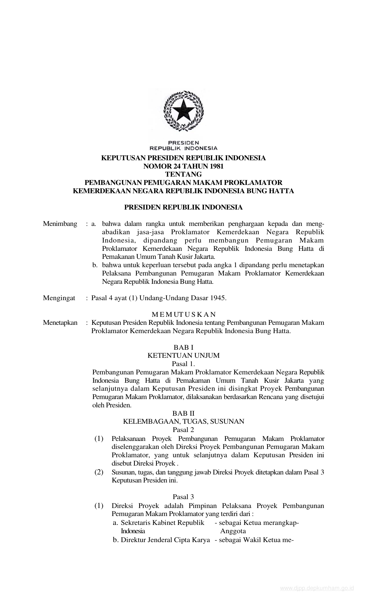 KEPPRES Nomor 24 Tahun 1981 | Keputusan Presiden Nomor 24 Tahun 1981 tentang PEMBANGUNAN PEMUGARAN MAKAM PROKLAMATOR KEMERDEKAAN NEGARA REPUBLIK INDONESIA BUNG HATTA