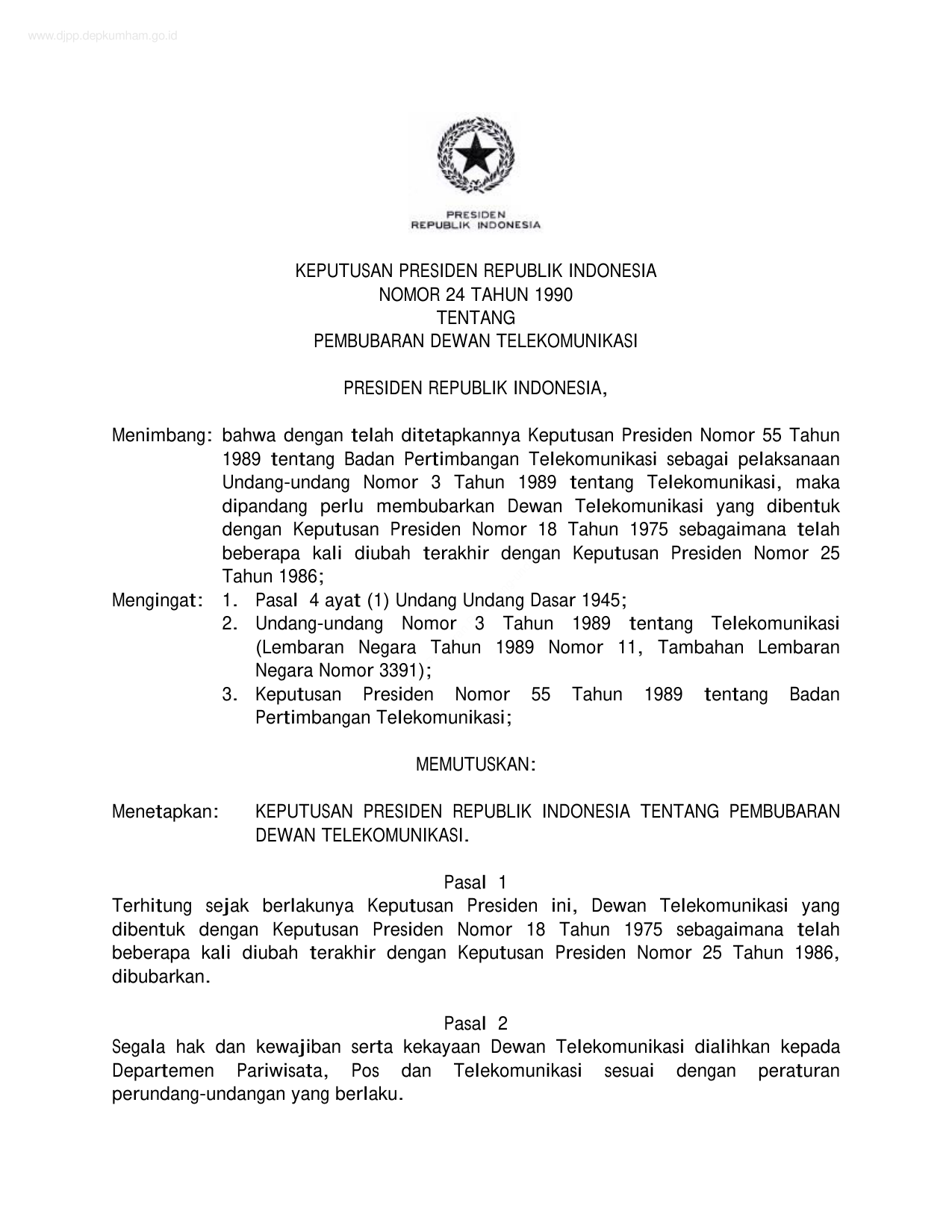 KEPPRES Nomor 24 Tahun 1990 | Keputusan Presiden Nomor 24 Tahun 1990 tentang PEMBUBARAN DEWAN TELEKOMUNIKASI