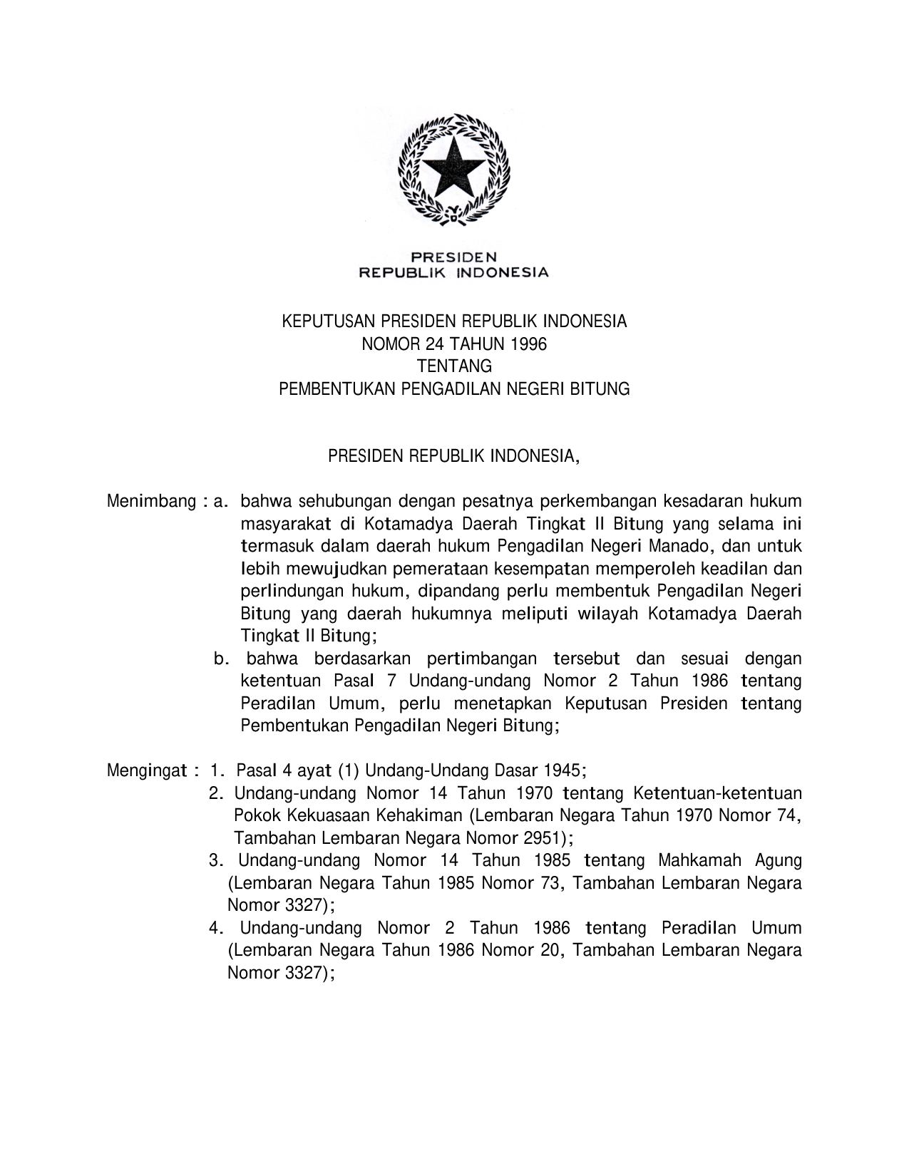KEPPRES Nomor 24 Tahun 1996 | Keputusan Presiden Nomor 24 Tahun 1996 tentang PEMBENTUKAN PENGADILAN NEGERI BITUNG