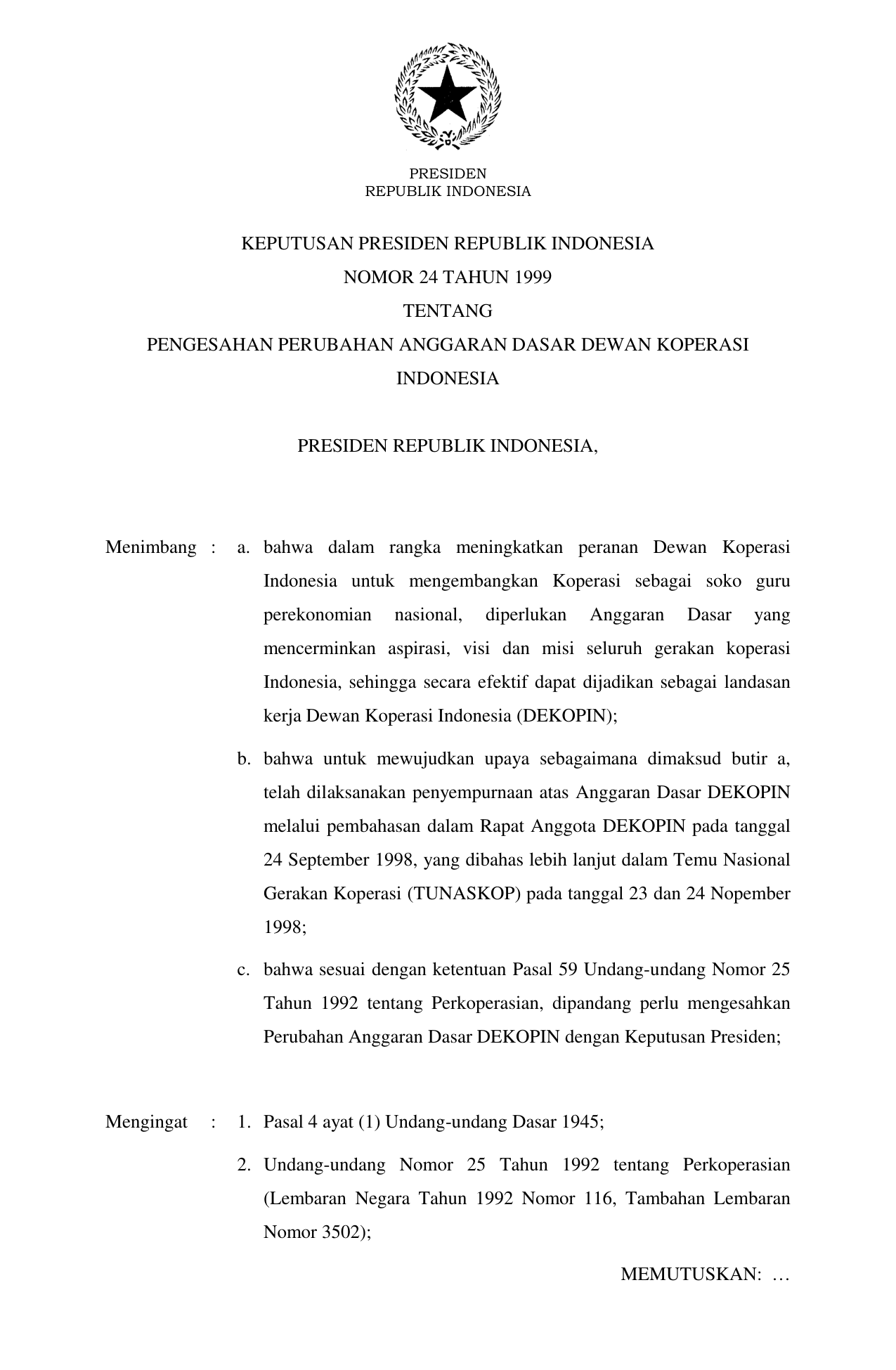 KEPPRES Nomor 24 Tahun 1999 | Keputusan Presiden Nomor 24 Tahun 1999 tentang PENGESAHAN PERUBAHAN ANGGARAN DASAR DEWAN KOPERASI INDONESIA