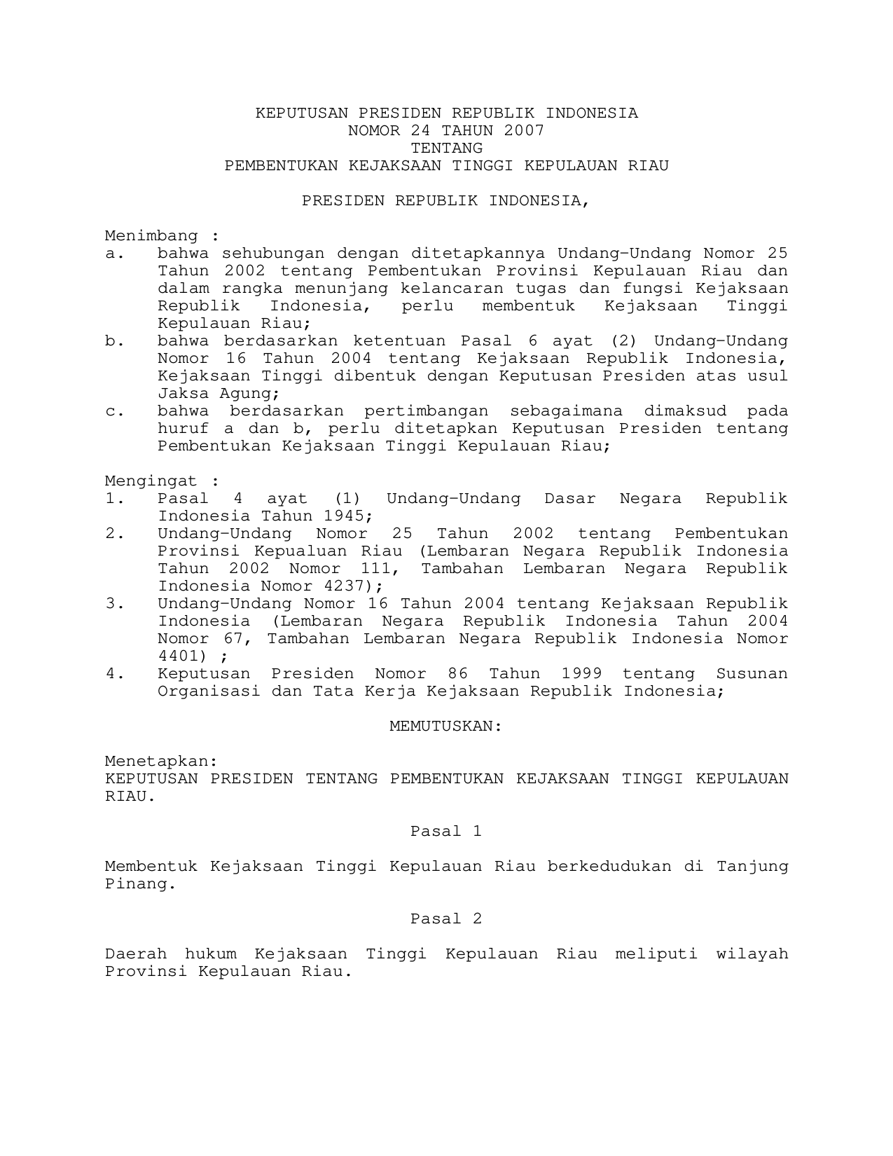 KEPPRES Nomor 24 Tahun 2007 | Keputusan Presiden Nomor 24 Tahun 2007 tentang PEMBENTUKAN KEJAKSAAN TINGGI KEPULAUAN RIAU