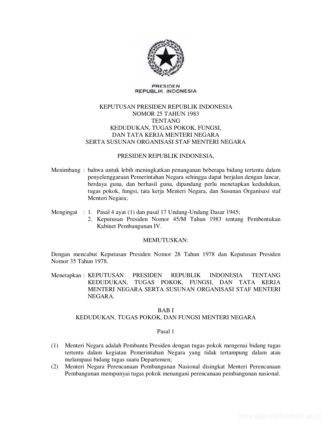 KEPPRES Nomor 25 Tahun 1983 | Keputusan Presiden Nomor 25 Tahun 1983 tentang KEDUDAKAN, TUGAS POKOK, FUNGSI DAN TATA KERJA MENTERI NEGARA SERTA SUSUNAN ORGANISASI STAF MENTERI NEGARA