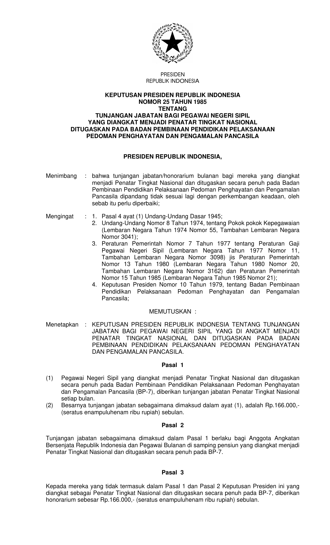 KEPPRES Nomor 25 Tahun 1985 | Keputusan Presiden Nomor 25 Tahun 1985 tentang TUNJANGAN JABATAN BAGI PEGAWAI NEGERI SIPIL YANG DIANGKAT MENJADI PENATAR TINGKAT NASIONAL DAN DITUGASKAN PADA BP-7