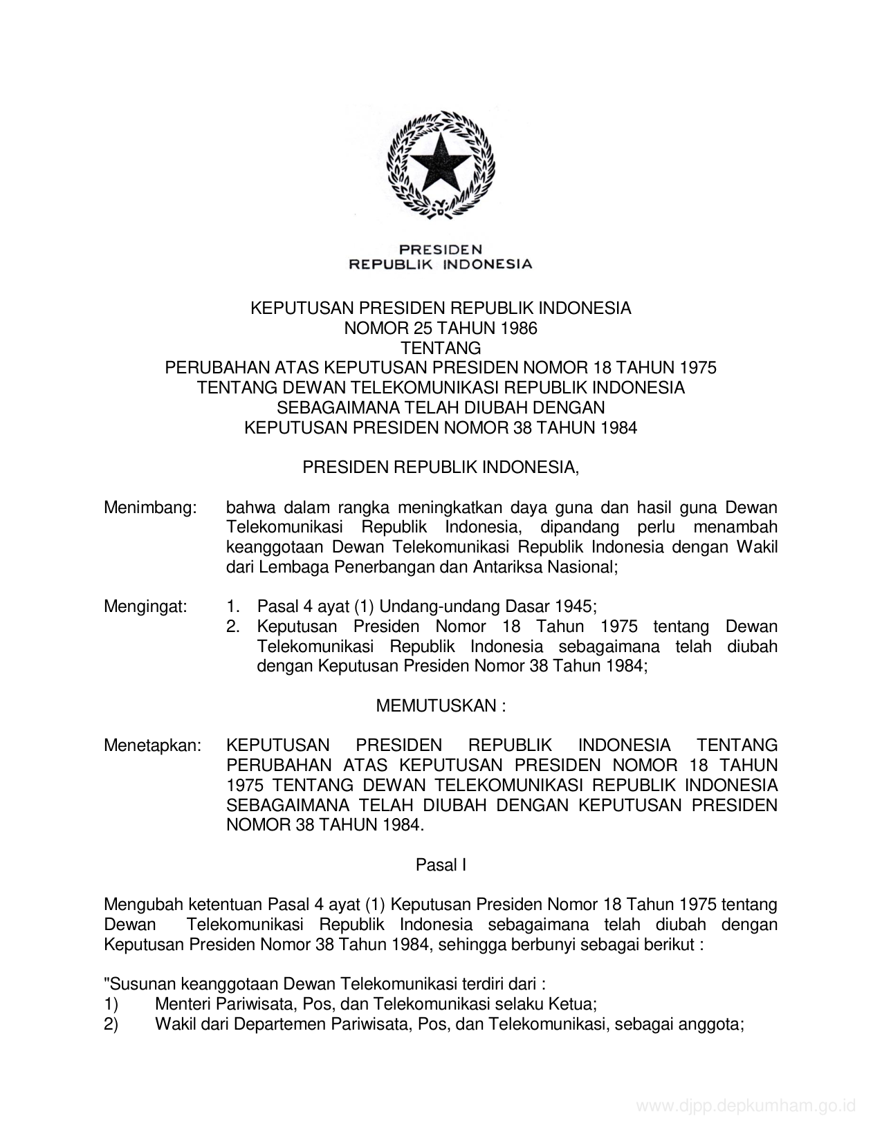 KEPPRES Nomor 25 Tahun 1986 | Keputusan Presiden Nomor 25 Tahun 1986 tentang PERUBAHAN ATAS KEPUTUSAN PRESIDEN NOMOR 18 TAHUN 1975 TENTANG DEWAN TELEKOMUNIKASI REPUBLIK INDONESIA SEBAGAIMANA TELAH DIUBAH DENGAN KEPUTUSAN PRESIDEN NOMOT 38 TAHUN 1984