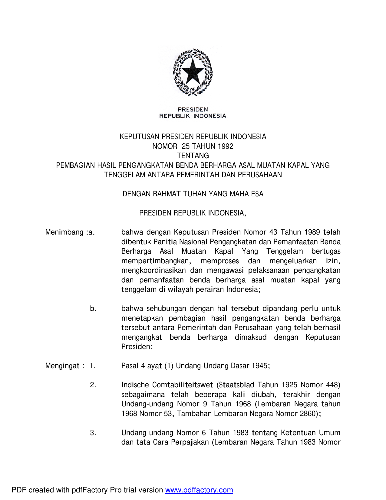 KEPPRES Nomor 25 Tahun 1992 | Keputusan Presiden Nomor 25 Tahun 1992 tentang PEMBAGIAN HASIL PENGANGKATAN BENDA BERHARGA ASAL MUATAN KAPAL YANG TENGGELAM ANTARA PEMERINTAH DAN PERUSAHAAN