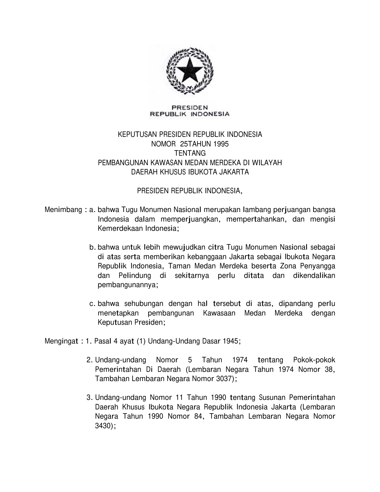 KEPPRES Nomor 25 Tahun 1995 | Keputusan Presiden Nomor 25 Tahun 1995 tentang PEMBANGUNAN KAWASAN MEDAN MERDEKA DI WILAYAH DKI JAKARTA