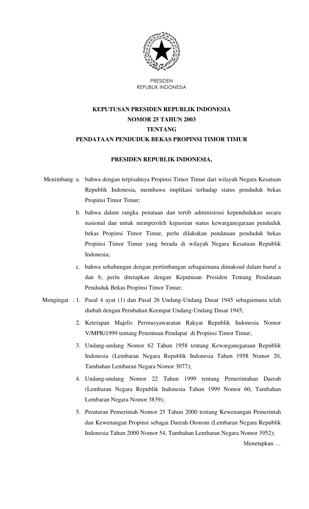 KEPPRES Nomor 25 Tahun 2003 | Keputusan Presiden Nomor 25 Tahun 2003 tentang PENDATAAN PENDUDUK BEKAS PROPINSI TIMOR TIMUR