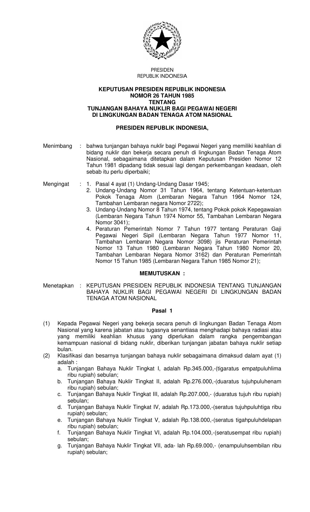 KEPPRES Nomor 26 Tahun 1985 | Keputusan Presiden Nomor 26 Tahun 1985 tentang TUNJANGAN BAHAYA NUKLIR BAGI PEGAWAI NEGERI DI LINGKUNGAN BADAN TENAGA ATOM NASIONAL