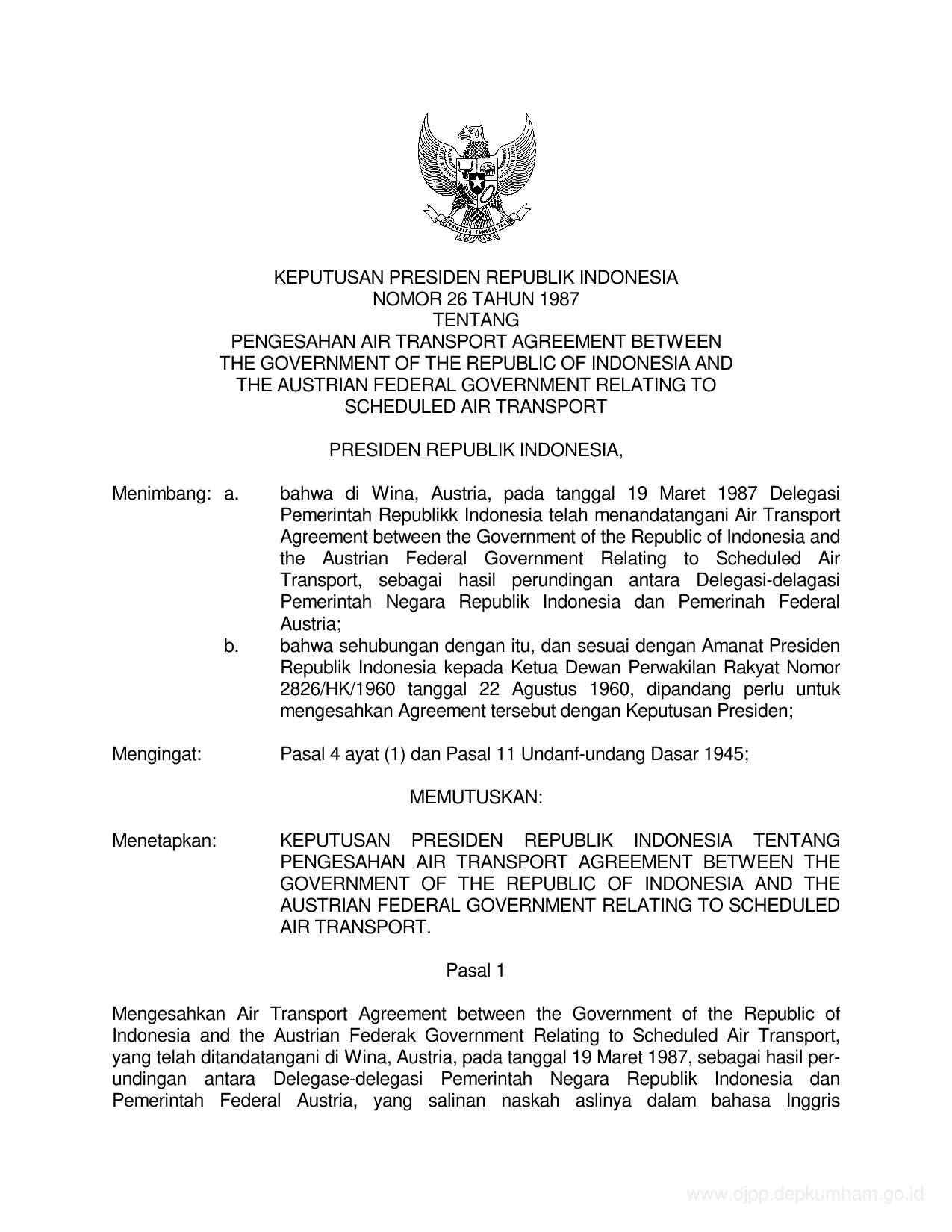KEPPRES Nomor 26 Tahun 1987 | Keputusan Presiden Nomor 26 Tahun 1987 tentang PENGESAHAN AIR TRANSPORT AGREEMENT BETWEEN THE GOVERMENT OF THE REPUBLIK OF INDONESIA AND THE AUSTRIAN FEDERAL GOVERMENT RELATING TO SCHEDULED AIR TRANSPORT