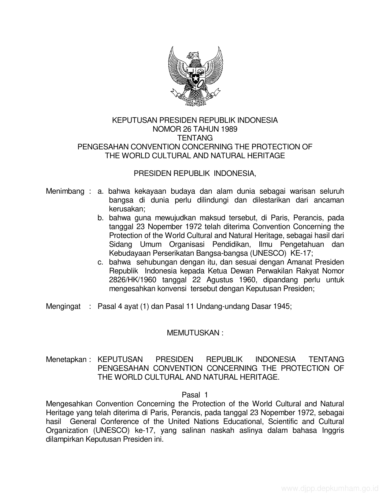 KEPPRES Nomor 26 Tahun 1989 | Keputusan Presiden Nomor 26 Tahun 1989 tentang PENGESAHAN CONVENTION CONCERNING THE PROTECTION OF THE WORLD CULTURAL AND NATURAL HERITAGE