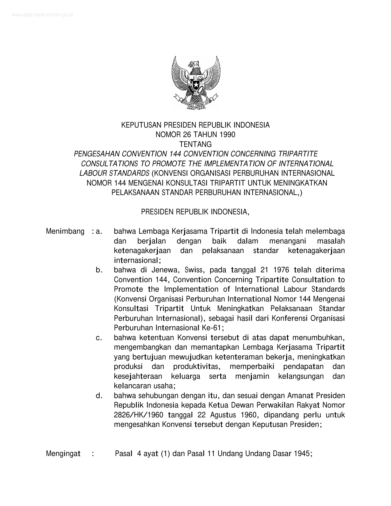KEPPRES Nomor 26 Tahun 1990 | Keputusan Presiden Nomor 26 Tahun 1990 tentang PENGESAHAN CONVENTION 144 CONVENTION CONCERNING TRIPARTITE CONSULTATIONS TO PROMOTE THE IMPLEMENTATION OF INTERNATIONAL LABOUR STANDARDS (KONVENSI ORGANISASI PERBURUHAN INTERNASIONAL NOMOR 144 MENGENAI KONSULTASI TRIPARTIT UNTUK MENINGKATKAN PELAKSANAAN STANDAR PERBURUHAN INTERNASIONAL,)