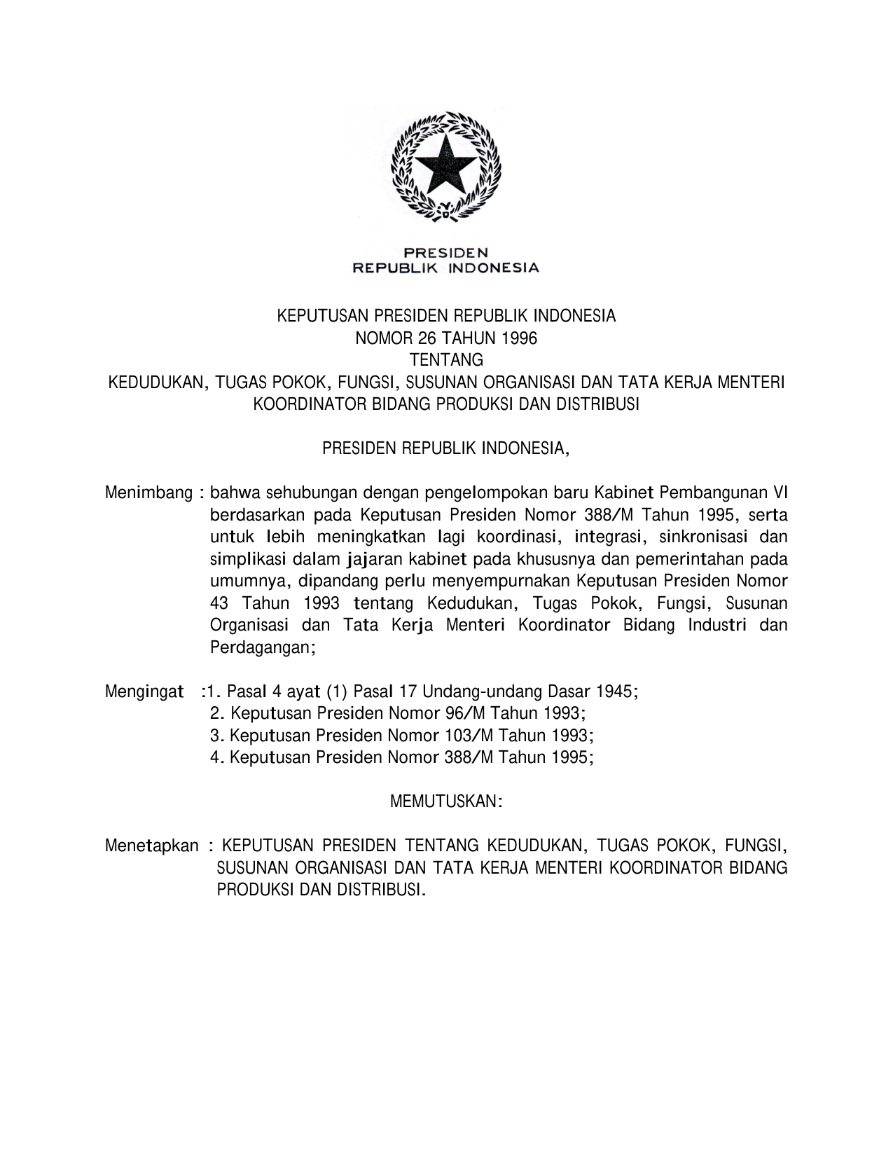 KEPPRES Nomor 26 Tahun 1996 | Keputusan Presiden Nomor 26 Tahun 1996 tentang KEDUDUKAN, TUGAS POKOK, FUNGSI DAN SUSUNAN ORGANISASI DAN TATA KERJA MENTERI KOORDINATOR BIDANG PRODUKSI DAN DISTRIBUSI