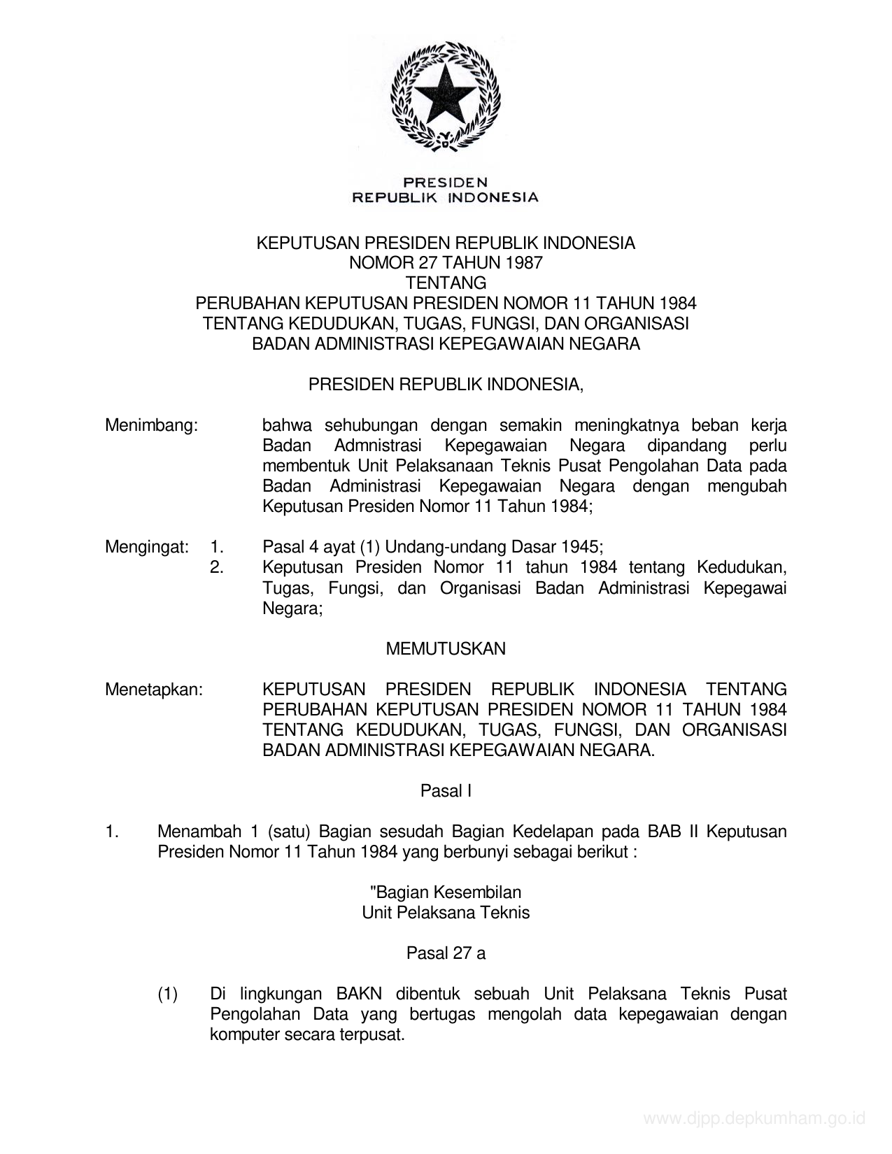 KEPPRES Nomor 27 Tahun 1987 | Keputusan Presiden Nomor 27 Tahun 1987 tentang PERUBAHAN KEPUTUSAN PRESIDEN NOMOR 11 TAHUN 1984 TENTANG KEDUDUKAN, TUGAS, FUNGSI DAN ORGANISASI BADAN KEPEGAWAIAN NEGARA