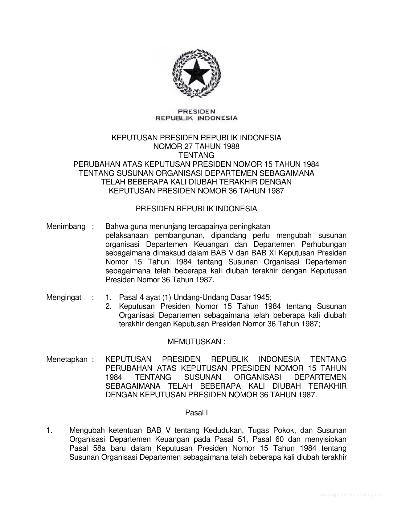 KEPPRES Nomor 27 Tahun 1988 | Keputusan Presiden Nomor 27 Tahun 1988 tentang PERUBAHAN ATAS KEPUTUSAN PRESIDEN NOMOR 18 TAHUN 1984 TENTANG SUSUNAN ORGANISASI DEPARTEMEN SEBAGAMANA TELAH BEBERAPA KALI DIUBAH TERAKHIR DENGAN KEPUTUSAN PRESIDEN NOMOR 36 TAHUN 1987