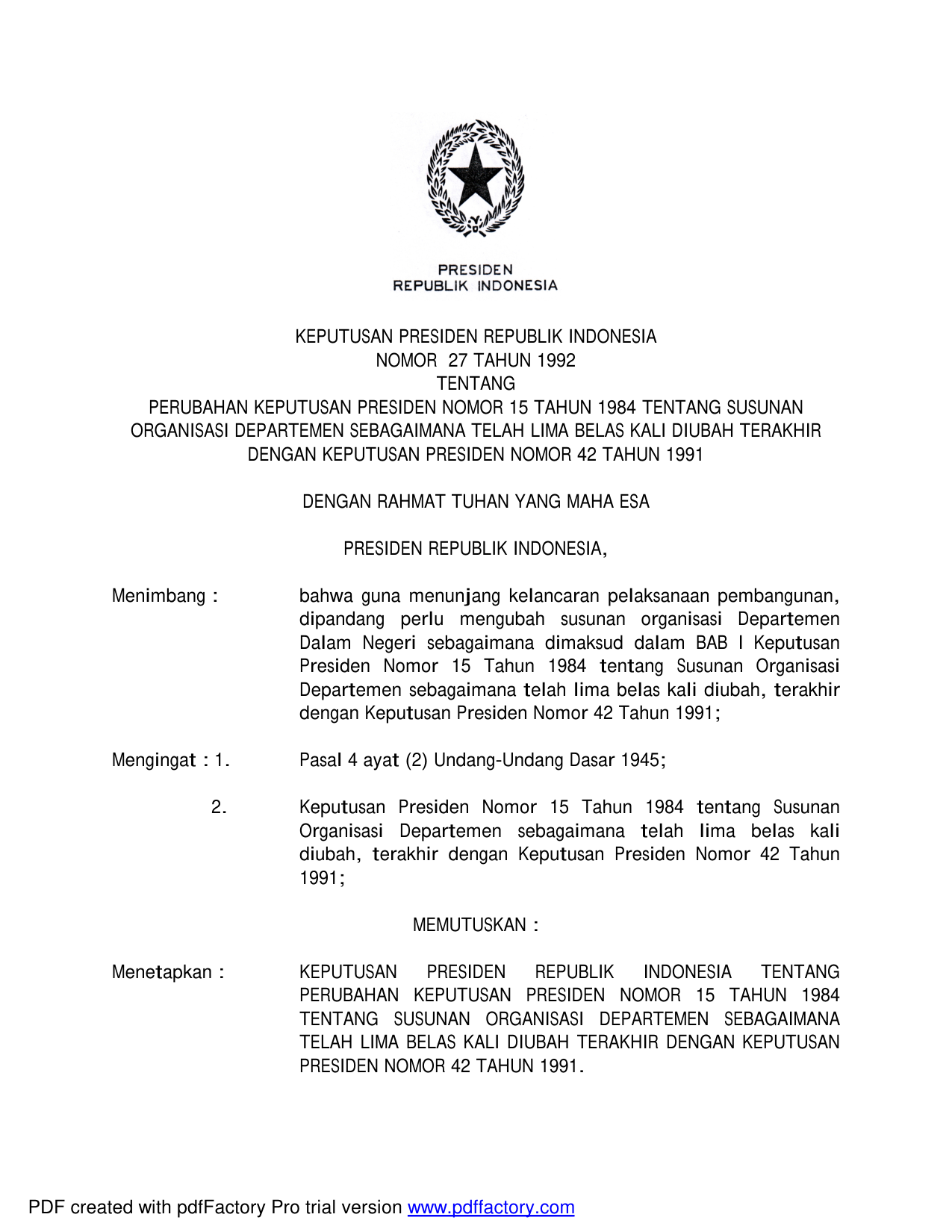 KEPPRES Nomor 27 Tahun 1992 | Keputusan Presiden Nomor 27 Tahun 1992 tentang PERUBAHAN KEPUTUSAN PRESIDEN NOMOR 15 TAHUN 1984 TENTANG SUSUNAN ORGANISASI DEPARTEMEN SEBAGAIMANA TELAH LIMABELAS KALI DIUBAH TERAKHIR DENGAN KEPUTUSAN PRESIDEN NOMOR 42 TAHUN 1991