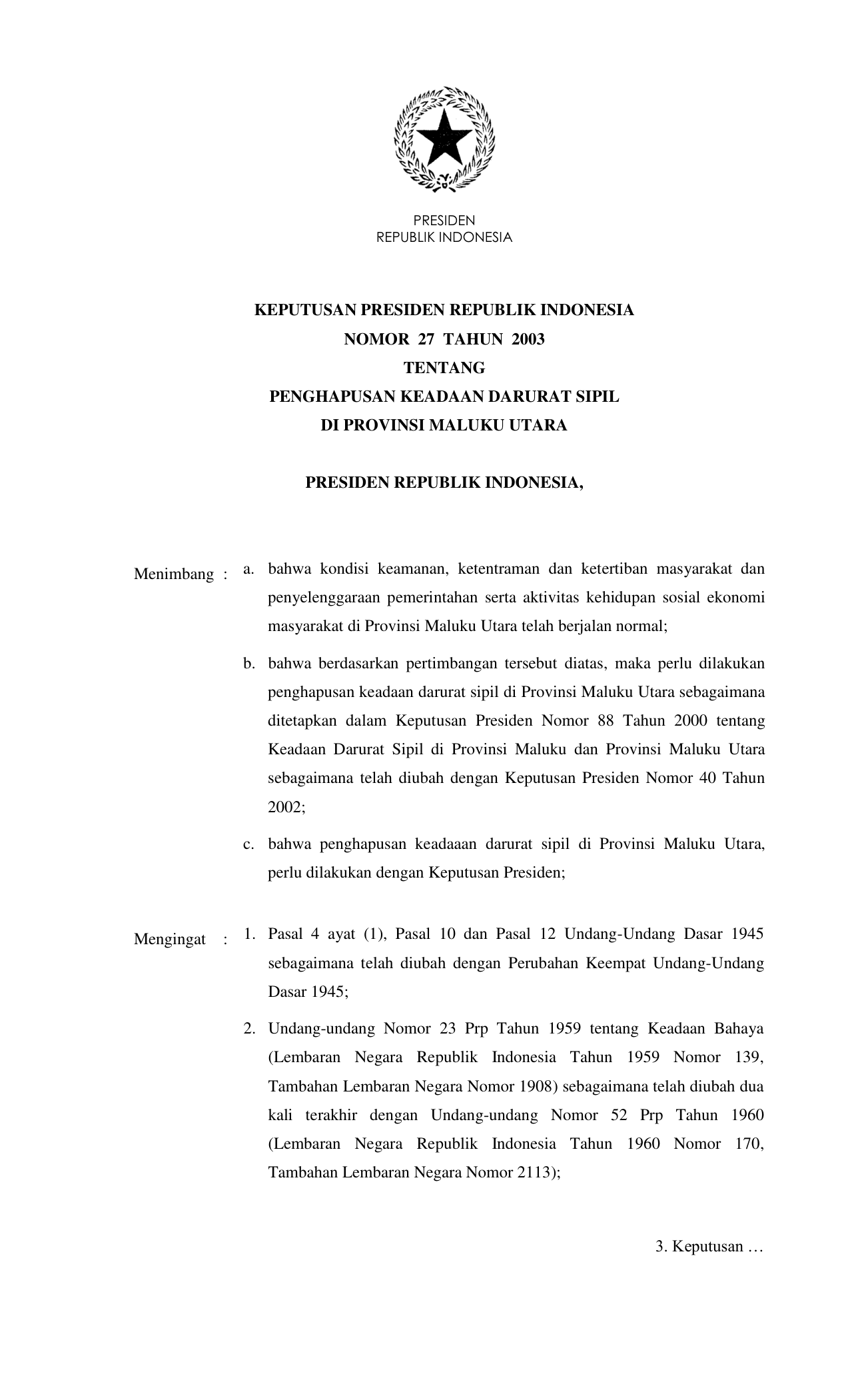 KEPPRES Nomor 27 Tahun 2003 | Keputusan Presiden Nomor 27 Tahun 2003 tentang PENGHAPUSAN KEADAAN DARURAT SIPIL DI PROVINSI MALUKU UTARA