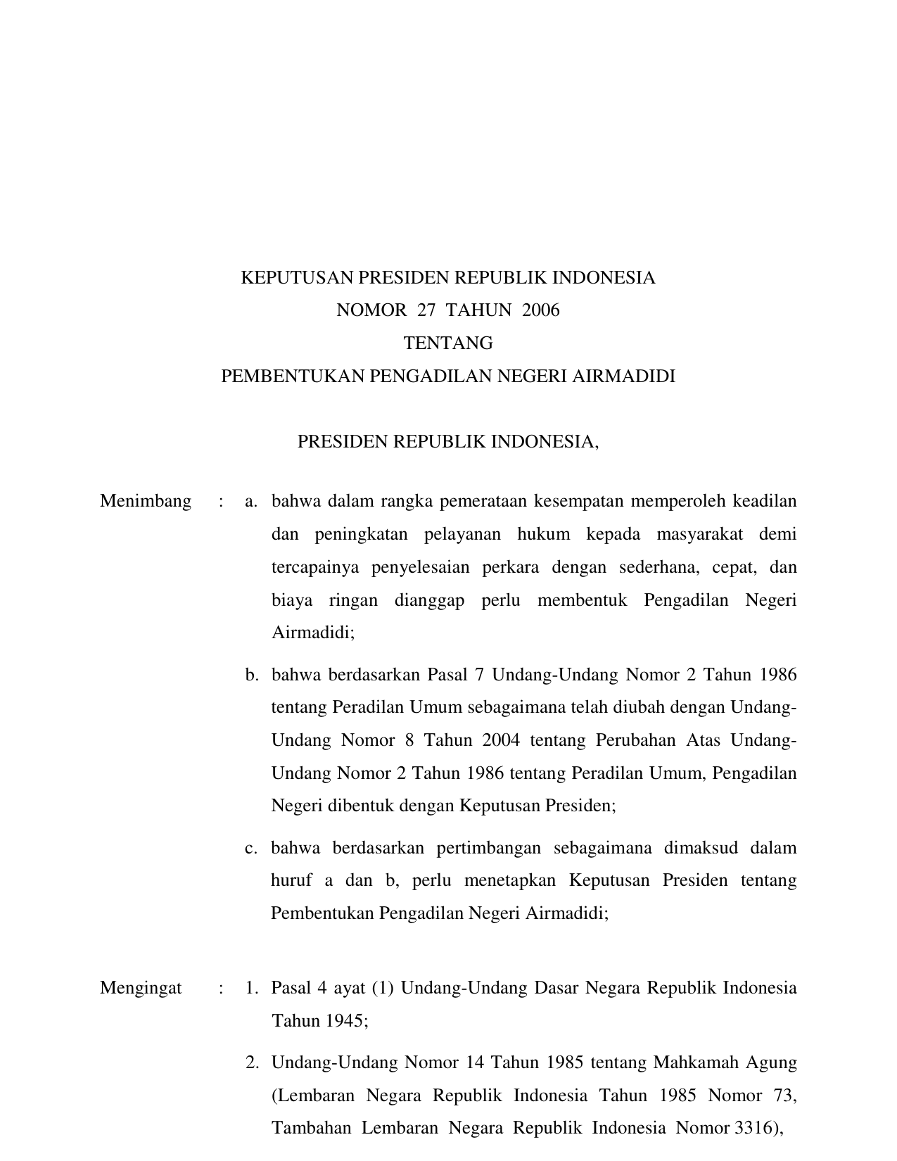 KEPPRES Nomor 27 Tahun 2006 | Keputusan Presiden Nomor 27 Tahun 2006 tentang PEMBENTUKAN PENGADILAN NEGERI AIR MADIDI