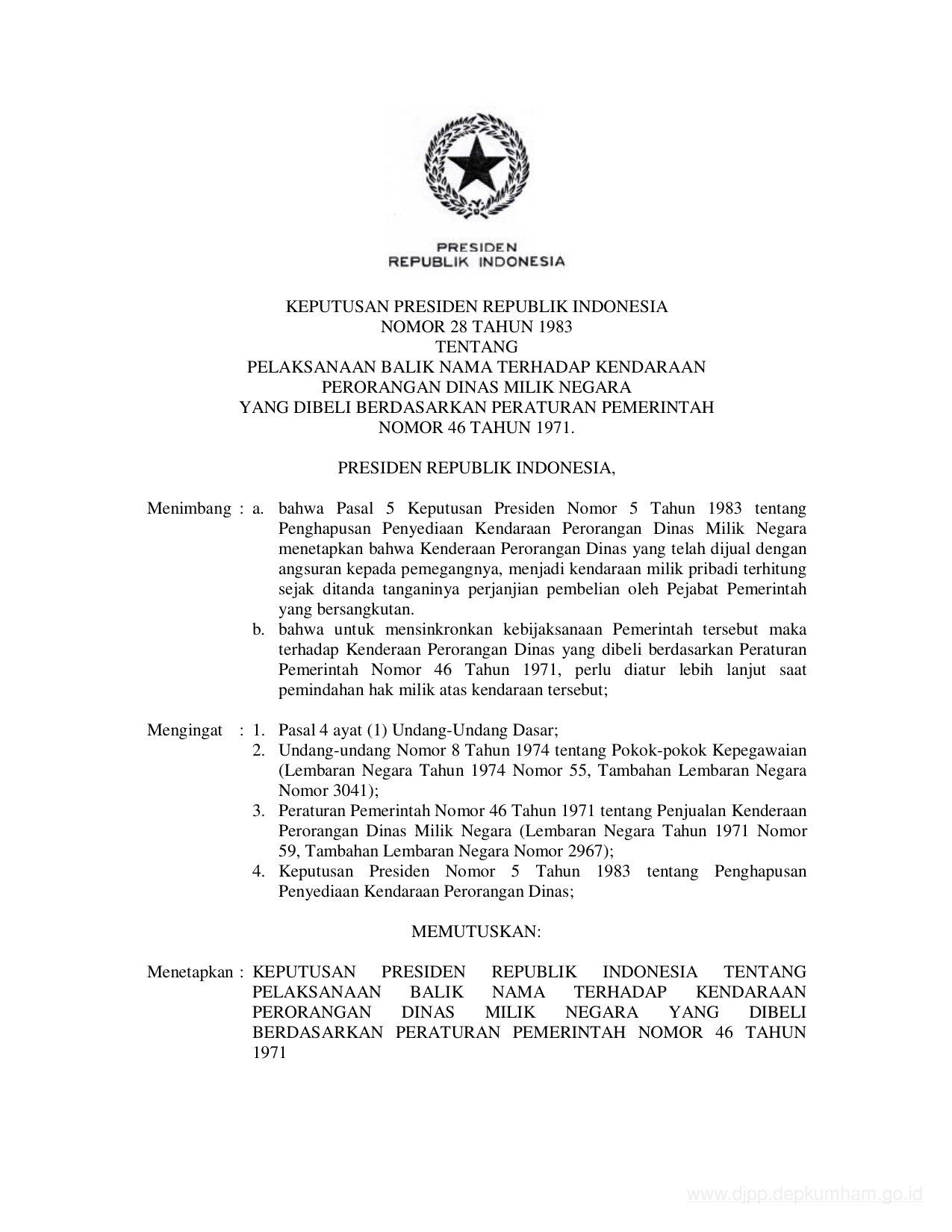 KEPPRES Nomor 28 Tahun 1983 | Keputusan Presiden Nomor 28 Tahun 1983 tentang PELAKSANAAN BALIK NAMA TERHADAP KENDARAAN PERORANGAN DINAS MILIK NEGARA YANG DIBELI BERDASARKAN PERATURAN PEMERINTAH NOMOR 46 TAHUN 1971