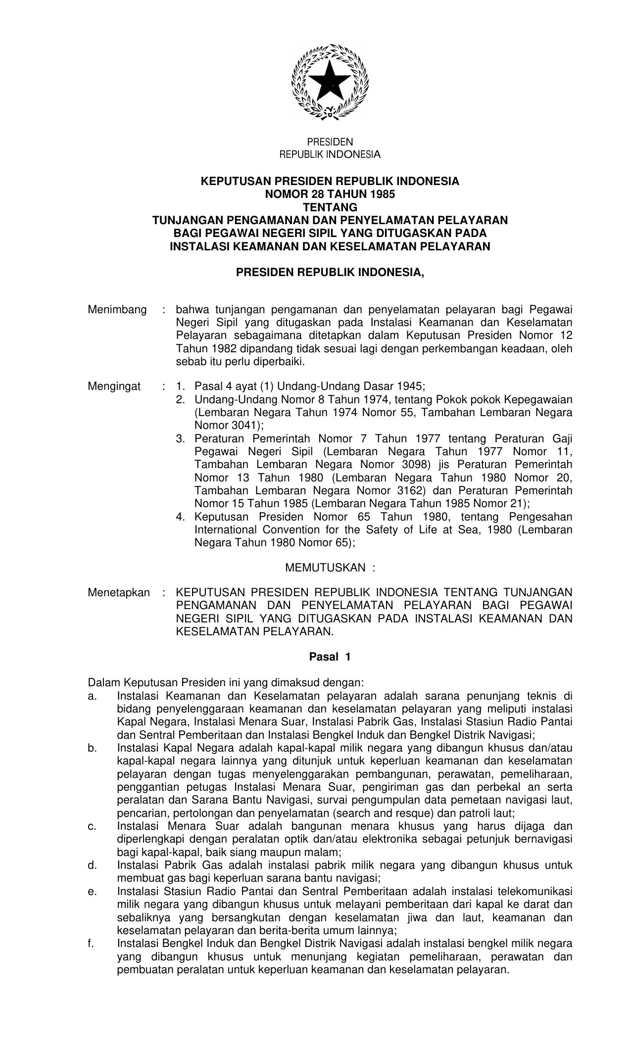 KEPPRES Nomor 28 Tahun 1985 | Keputusan Presiden Nomor 28 Tahun 1985 tentang TUNJANGAN PENGAMANAN DAN PENYELAMATAN PELAYARAN BAGI PEGAWAI NEGERI SIPIL YANG DITUGASKAN PADA INSTALASI DAN KESELAMATAN PELAYARAN