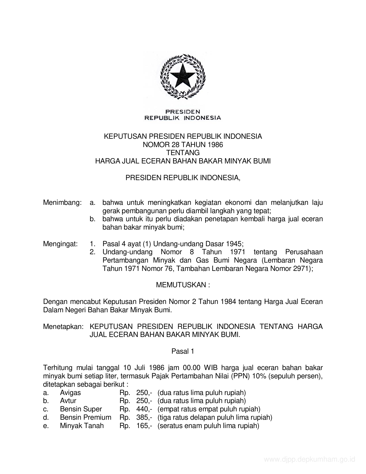 KEPPRES Nomor 28 Tahun 1986 | Keputusan Presiden Nomor 28 Tahun 1986 tentang HARGA JUAL ECERAN BAHAN BAKAR MINYAK BUMI