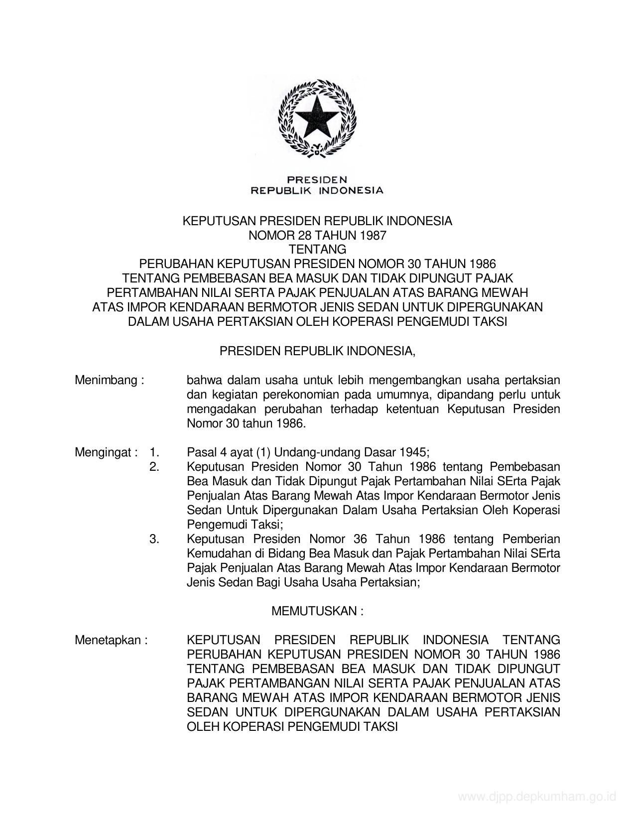 KEPPRES Nomor 28 Tahun 1987 | Keputusan Presiden Nomor 28 Tahun 1987 tentang PERUBAHAN KEPUTUSAN PRESIDEN NOMOR 30 TAHUN 1986 TENTANG PEMBEBASAN BEA MASUK DAN TIDAK DI PUNGUT PAJAK PERTAMBAHAN NILAI SERTA PAJAK PENJUALAN ATAS BARANG MEWAH ATAS IMPOR KENDARAAN BERMOTOR JENIS SEDAN UNTUK DIGUNAKAN DALAM USAHA PERTAKSIAN OLEH KOPERASI PENGEMUDI TAKSI