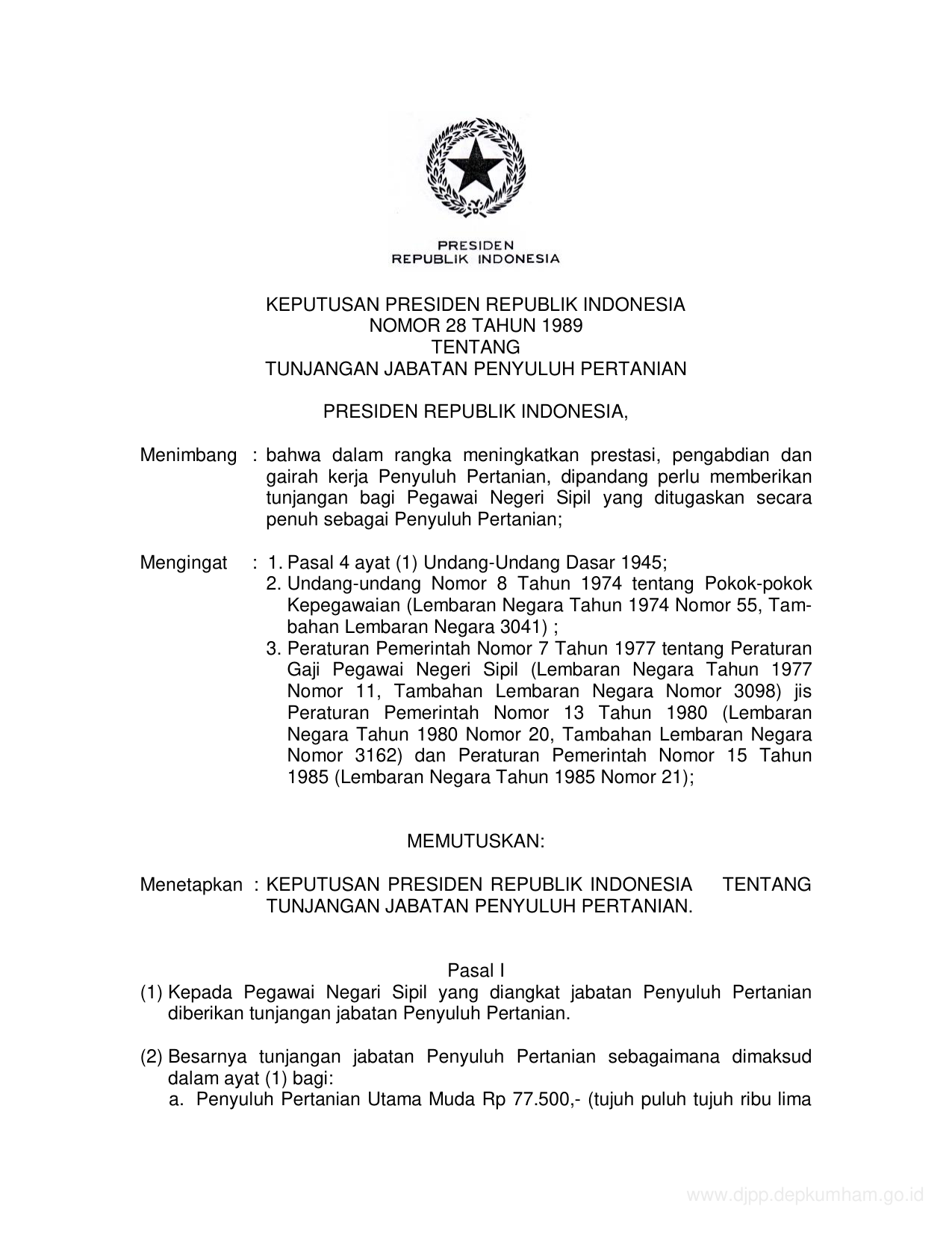 KEPPRES Nomor 28 Tahun 1989 | Keputusan Presiden Nomor 28 Tahun 1989 tentang TUNJANGAN JABATAN PERTANIAN