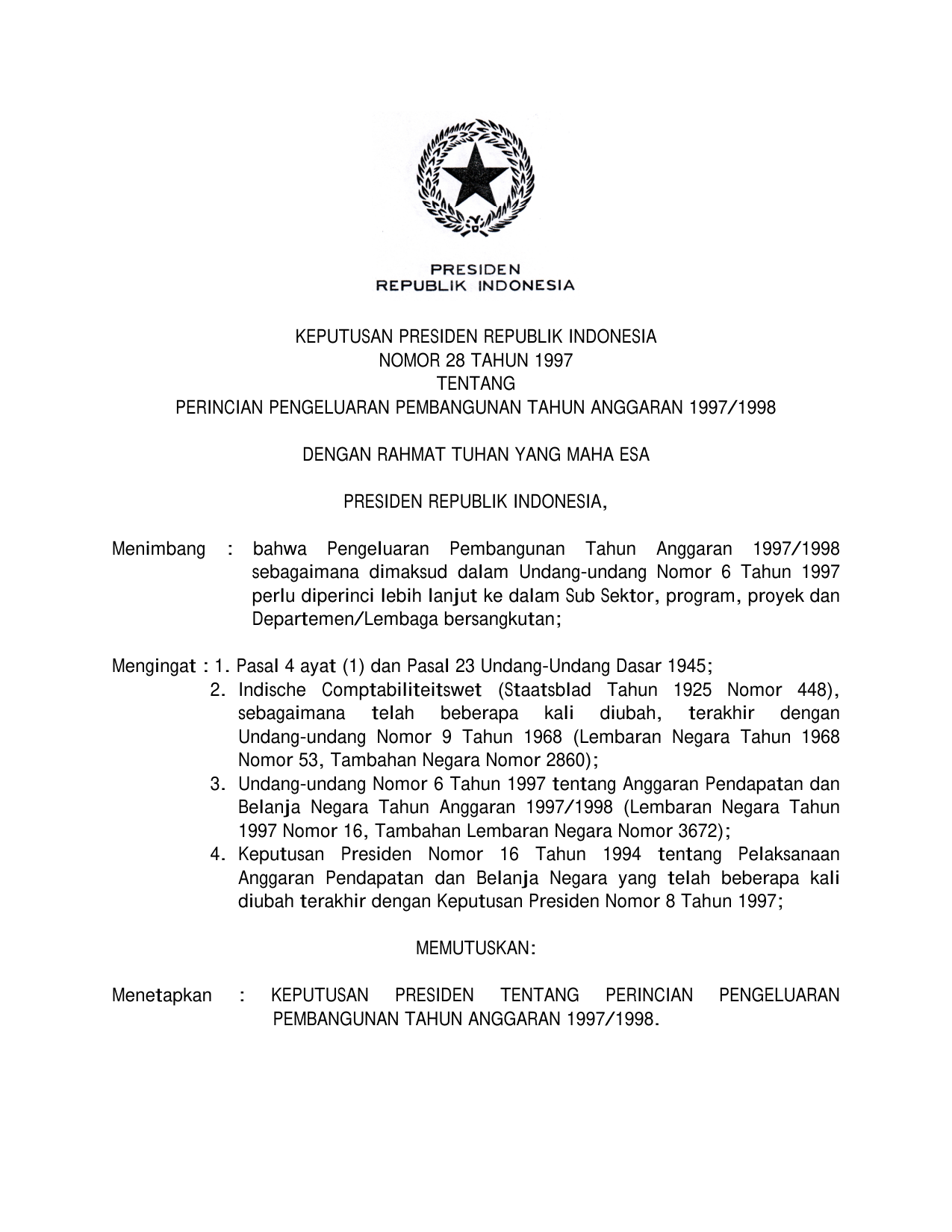 KEPPRES Nomor 28 Tahun 1997 | Keputusan Presiden Nomor 28 Tahun 1997 tentang PERINCIAN PENGELUARAN PEMBANGUNAN TAHUN ANGGARAN 1997/1998