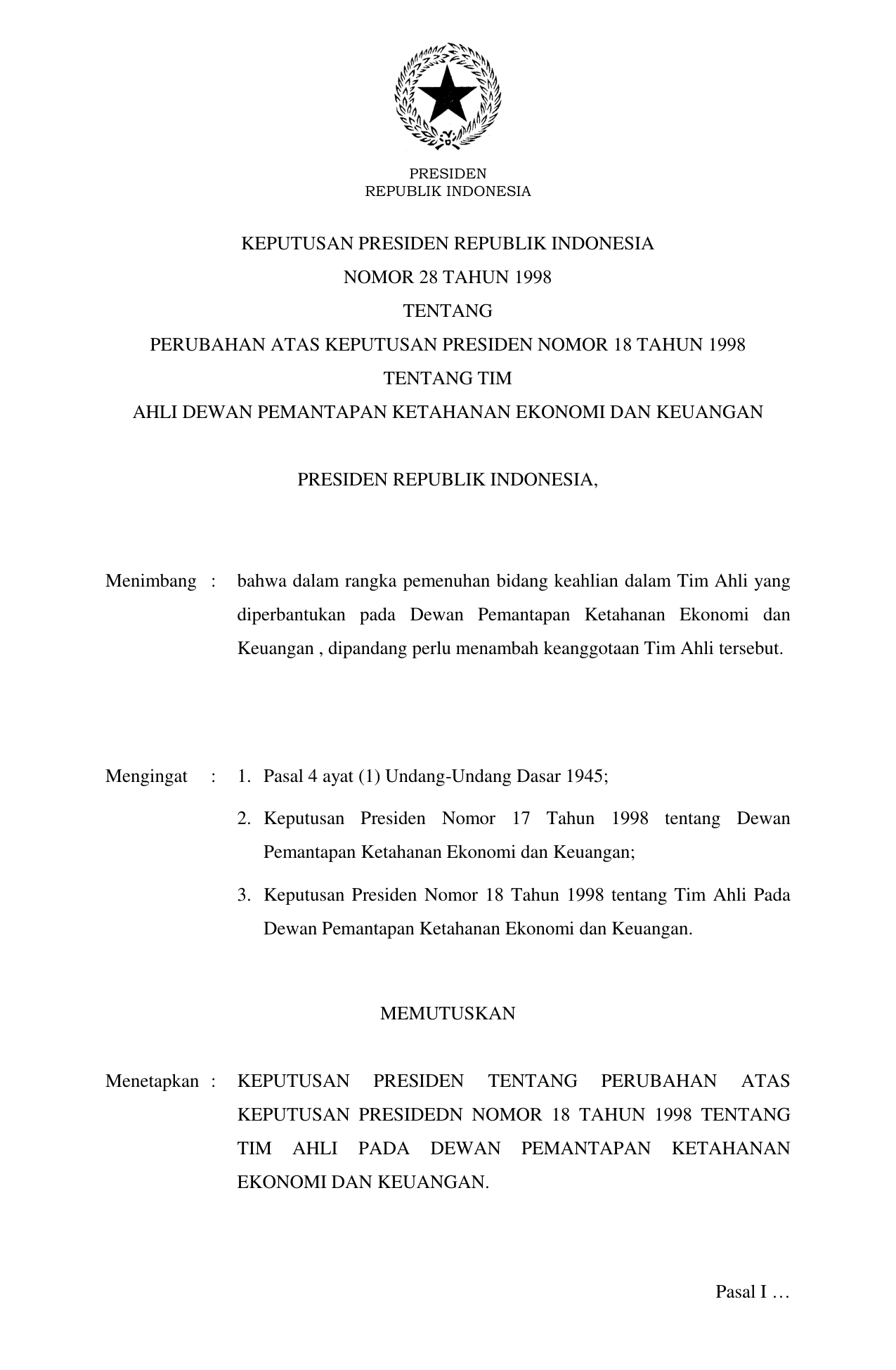 KEPPRES Nomor 28 Tahun 1998 | Keputusan Presiden Nomor 28 Tahun 1998 tentang PERUBAHAN KEPPRES 18-1996 TENTANG TIM AHLI PADA DEWAN PEMANTAPAN KETAHANAN EKONOMI DAN KEUANGAN