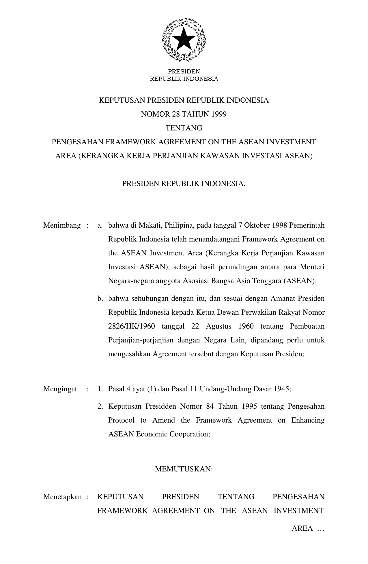 KEPPRES Nomor 28 Tahun 1999 | Keputusan Presiden Nomor 28 Tahun 1999 tentang PENGESAHAN FRAMEWORK AGREEMENT ON THE ASEAN INVESTMENT AREA (KERANGKA KERJA PERJANJIAN KAWASAN INVESTASI ASEAN)