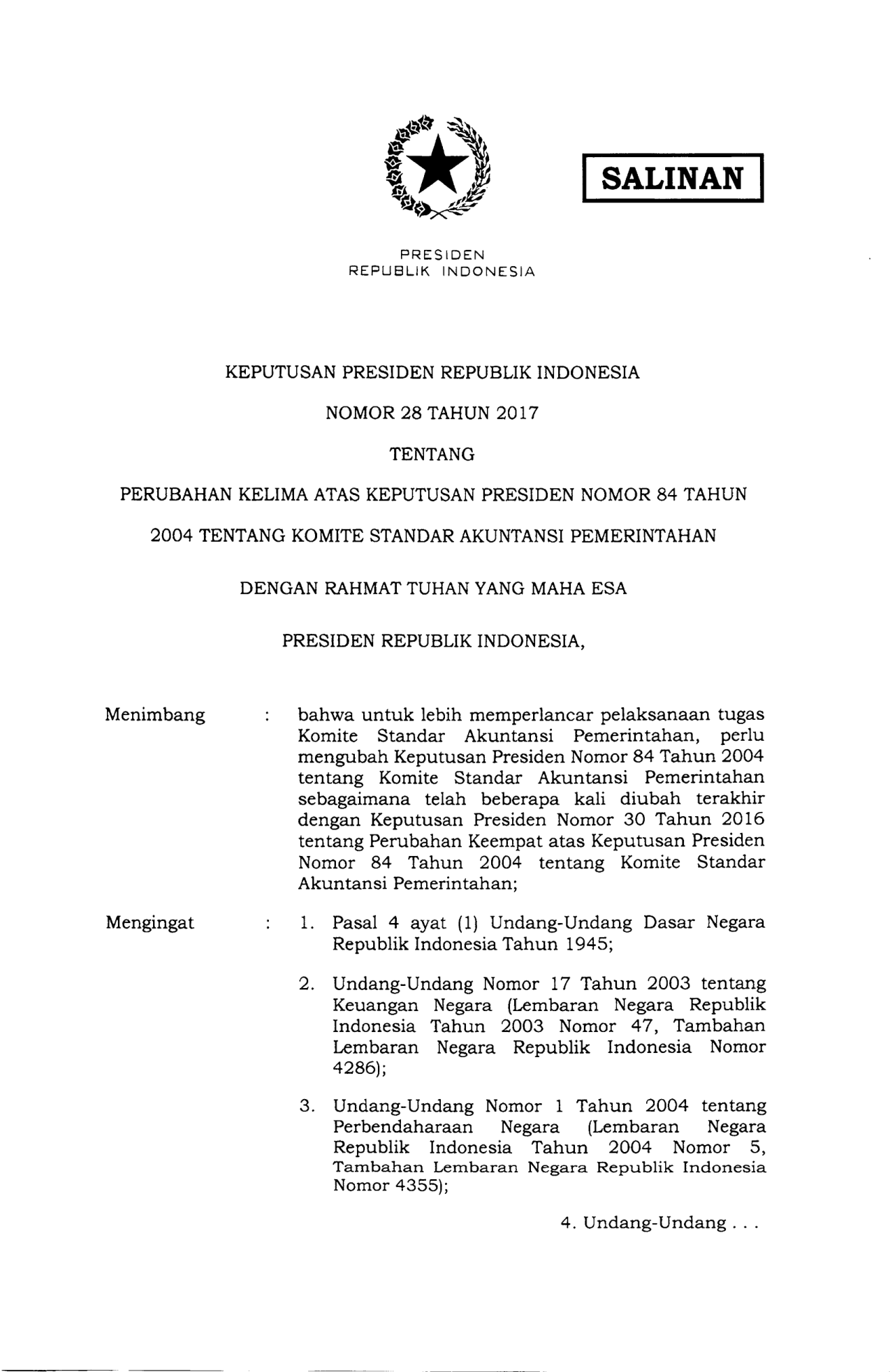 KEPPRES Nomor 28 Tahun 2017 | Keputusan Presiden Nomor 28 Tahun 2017 tentang PERUBAHAN KELIMA ATAS KEPUTUSAN PRESIDEN NOMOR 84 TAHUN 2004 TENTANG KOMITE STANDAR AKUNTANSI PEMERINTAHAN