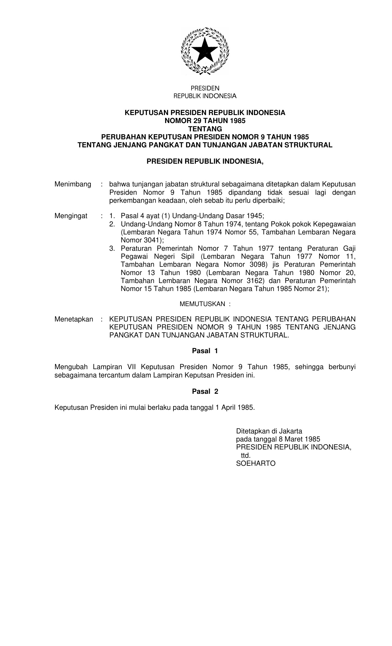 KEPPRES Nomor 29 Tahun 1985 | Keputusan Presiden Nomor 29 Tahun 1985 tentang PERUBAHAN KEPUTUSAN PRESIDEN NOMOR 9 TAHUN 1985 TENTANG JENJANG PANGKAT DAN TUNJANGAN STRUKTURAL