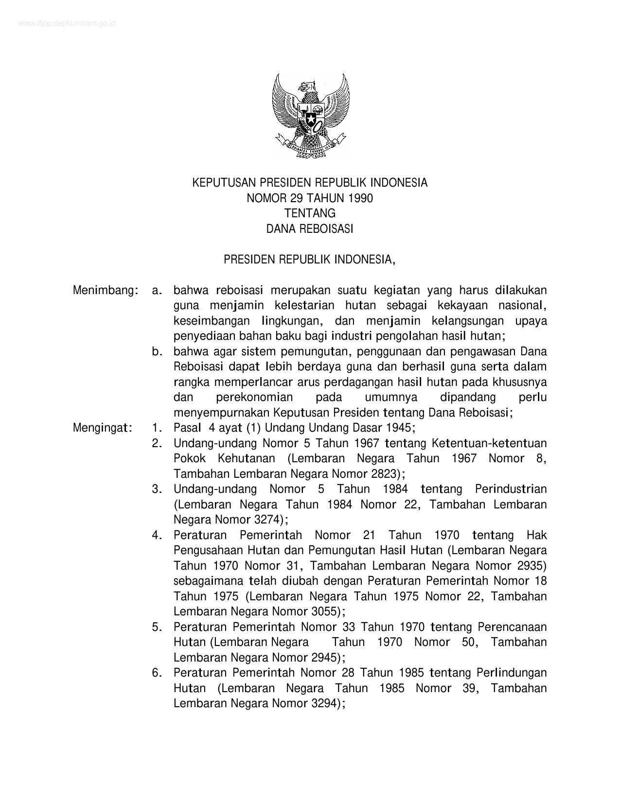 KEPPRES Nomor 29 Tahun 1990 | Keputusan Presiden Nomor 29 Tahun 1990 tentang DANA REBOISASI