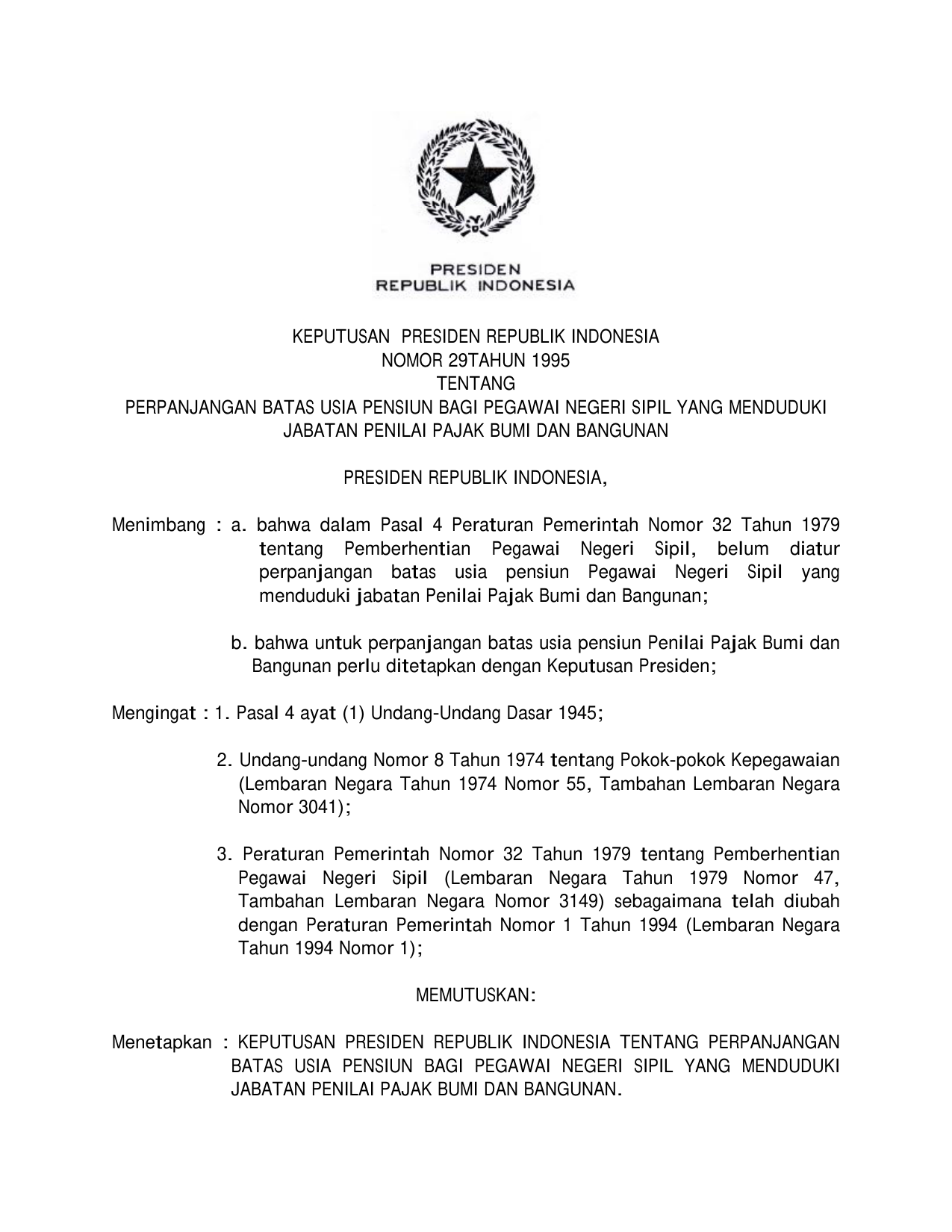 KEPPRES Nomor 29 Tahun 1995 | Keputusan Presiden Nomor 29 Tahun 1995 tentang PERPANJANGAN BATAS USIA PENSIUN BAGI PEGAWAI NEGERI SIPIL YANG MENDUDUKI JABATAN PENILAI PAJAK BUMI DAN BANGUNAN