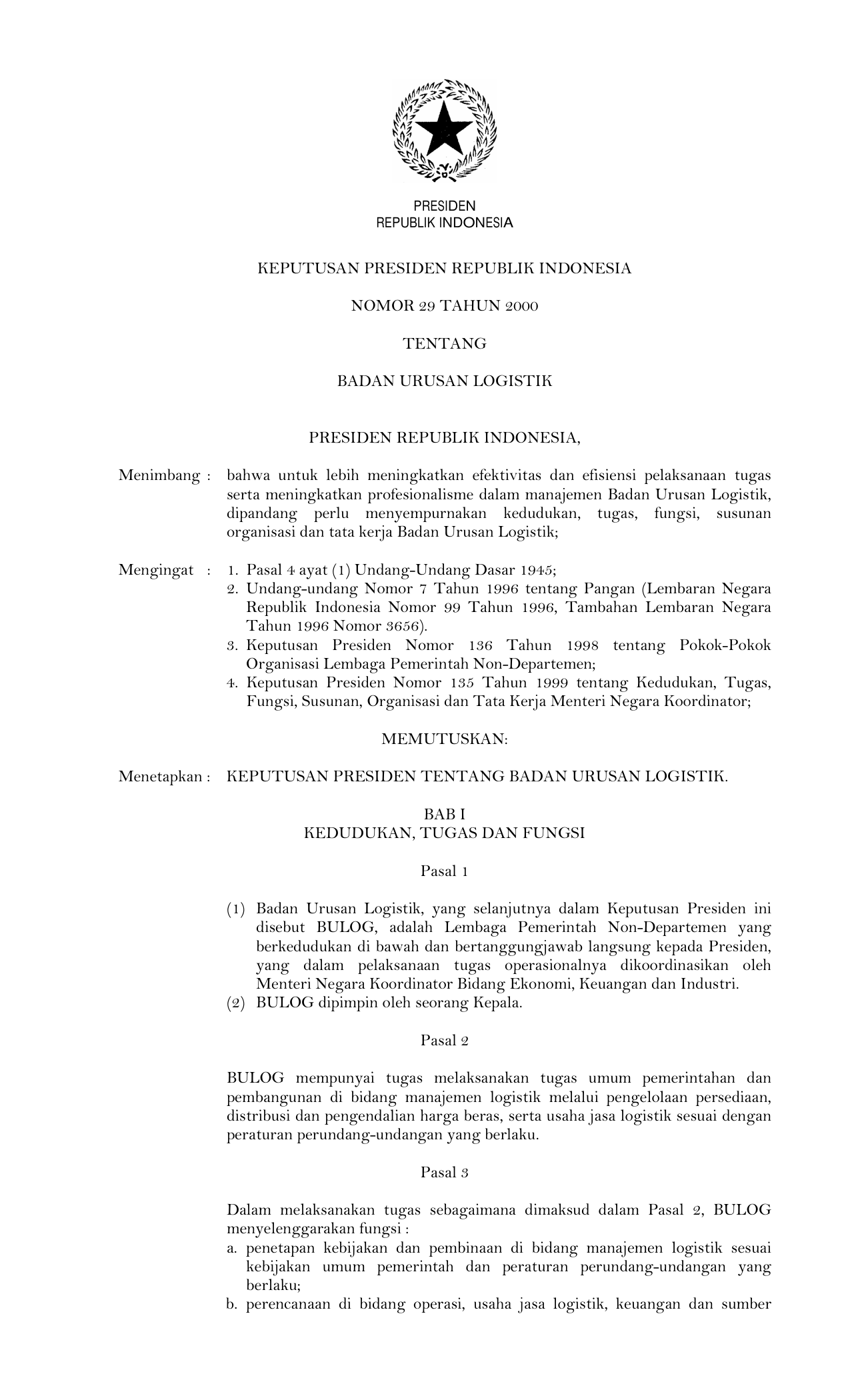 KEPPRES Nomor 29 Tahun 2000 | Keputusan Presiden Nomor 29 Tahun 2000 tentang BADAN URUSAN LOGISTIK