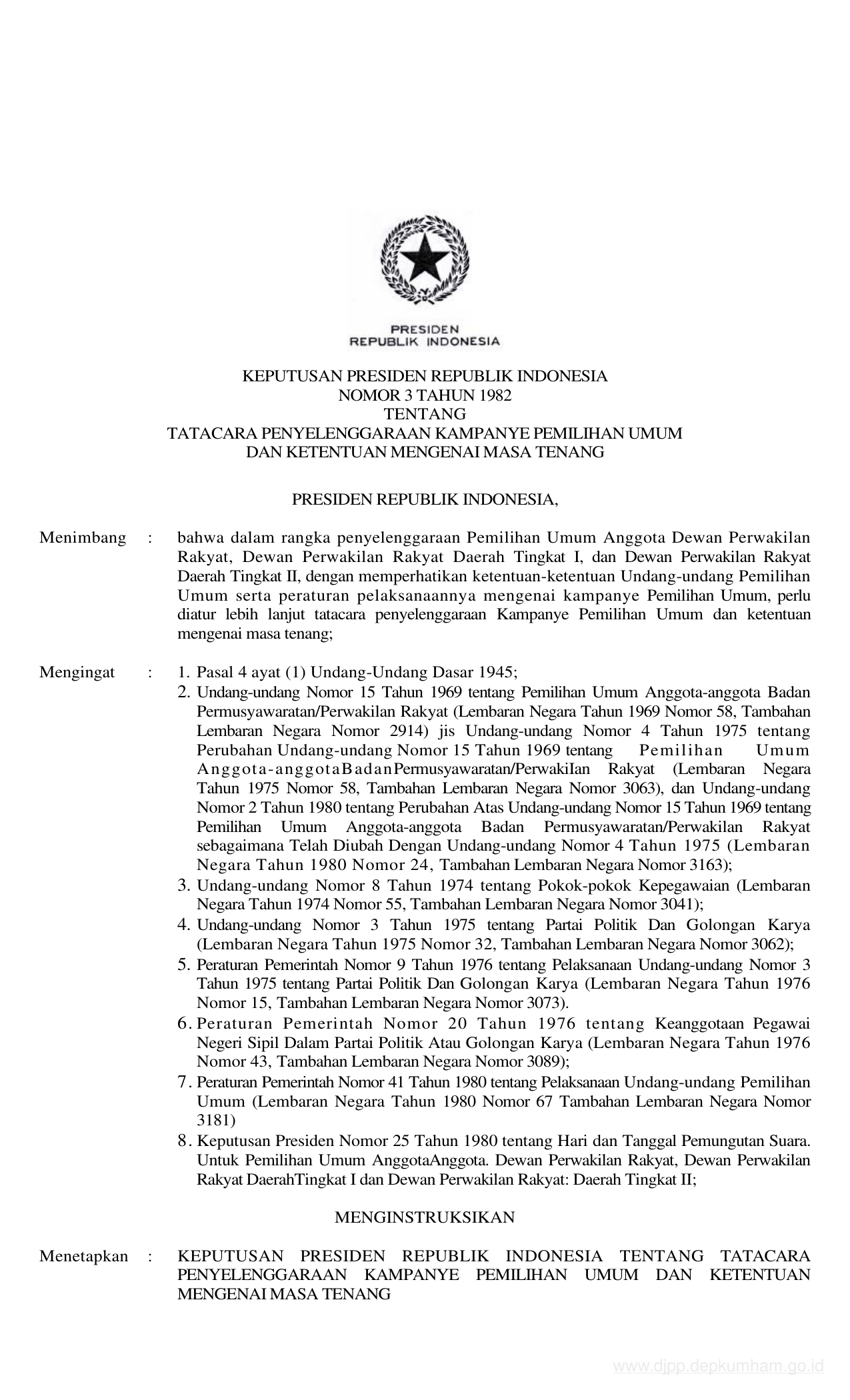 KEPPRES Nomor 3 Tahun 1982 | Keputusan Presiden Nomor 3 Tahun 1982 tentang TATA CARA PENYELENGGARAAN KAMPANYE PEMILIHAN UMUM DAN KETENTUAN MENGENAL MASA TENANG
