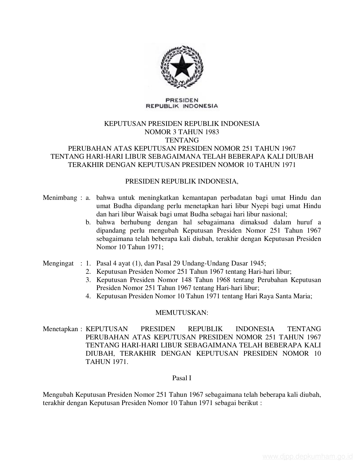 KEPPRES Nomor 3 Tahun 1983 | Keputusan Presiden Nomor 3 Tahun 1983 tentang PERUBAHAN ATAS KEPUTUSAN PRESIDEN NOMOR 251 TAHUN 1967 TENTANG LIBUR SEBAGAIMANA TELAH BEBERAPA KALI DIUBAH TERAKHIR DENGAN KEPUTUSAN PRESIDEN NOMOR 10 TAHUN 1971