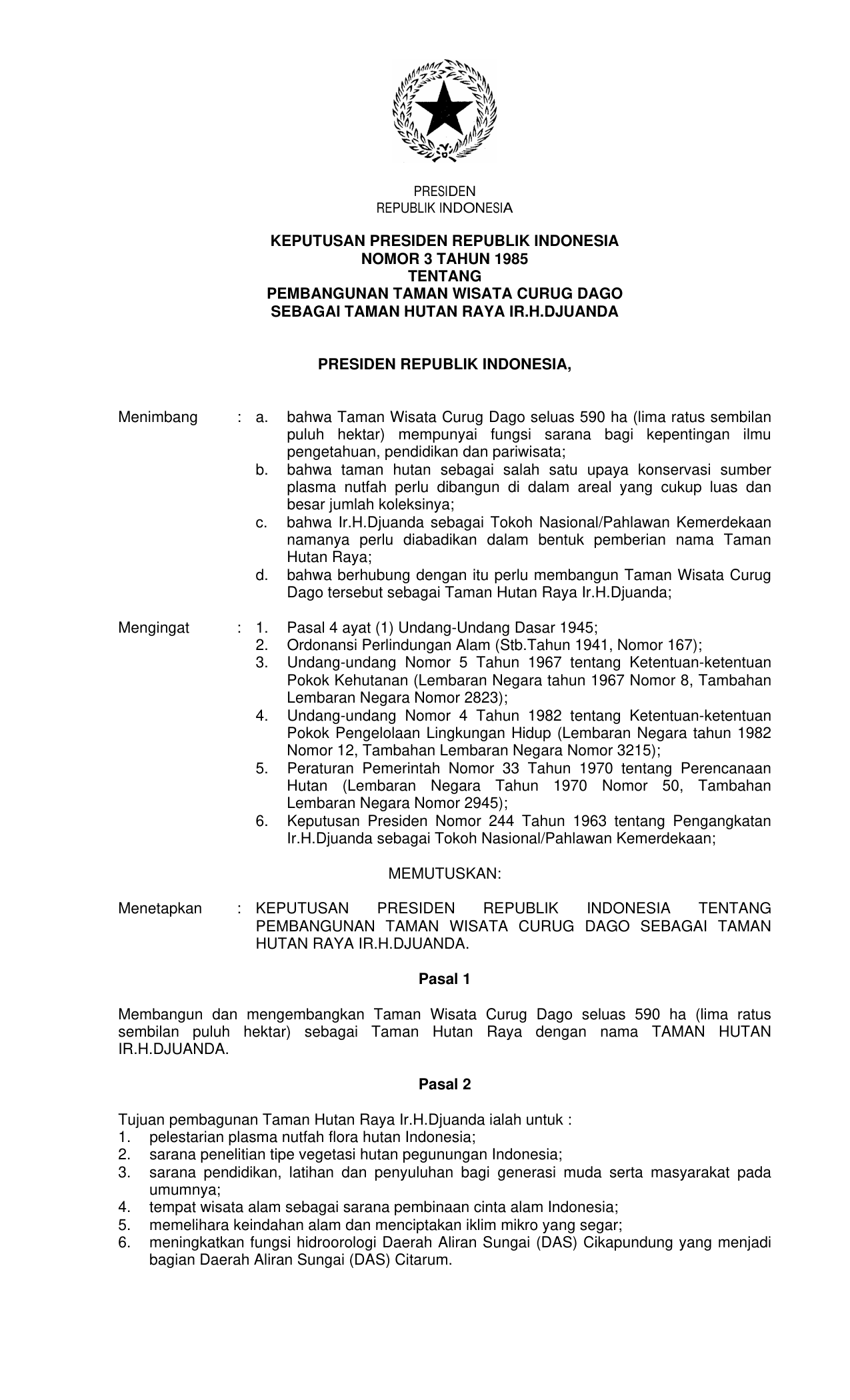 KEPPRES Nomor 3 Tahun 1985 | Keputusan Presiden Nomor 3 Tahun 1985 tentang PEMBANGUNAN TAMAN WISATA CURUG DAGO SEBAGAI TAMAN HUTAN RAYA IR.H. JUANDA